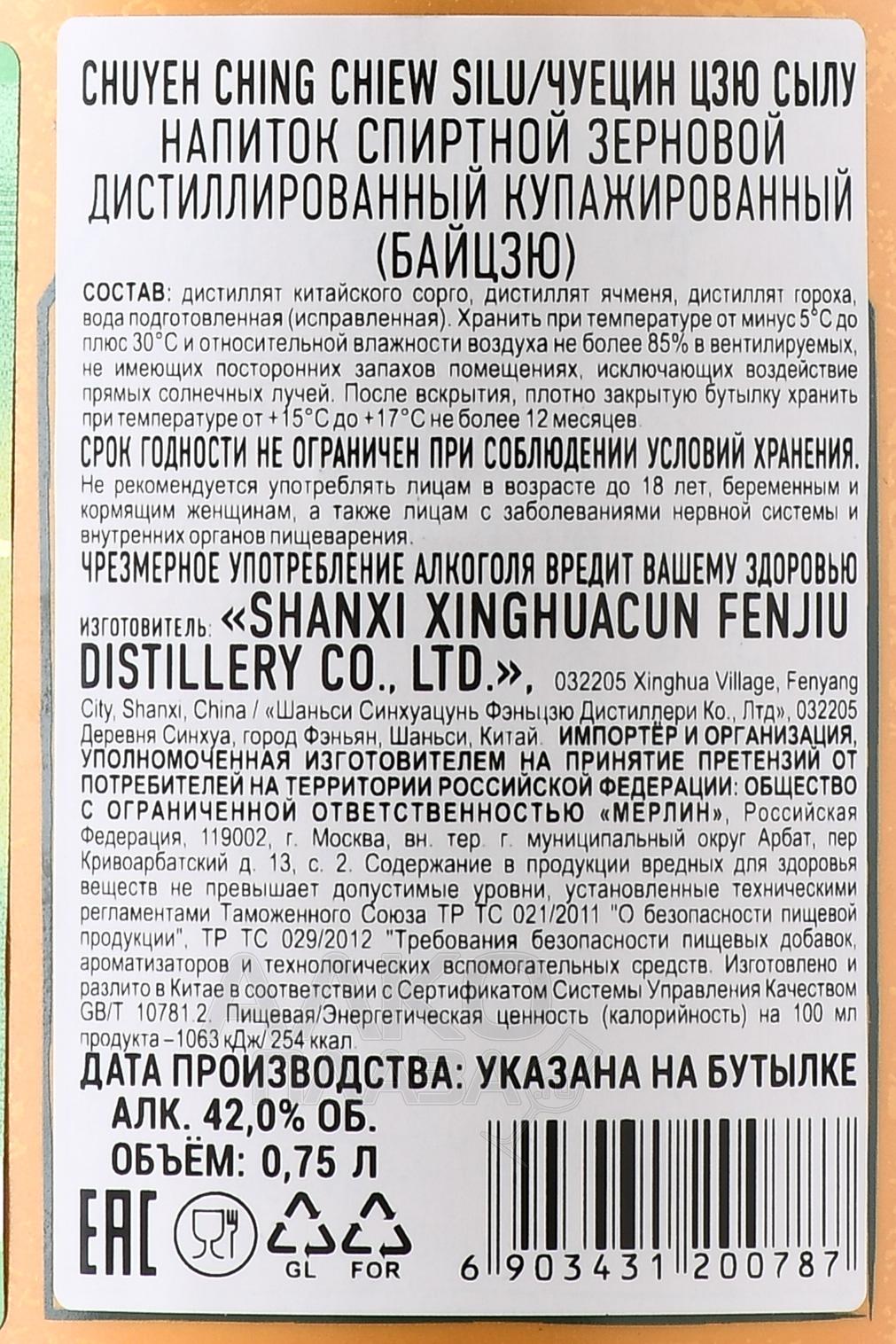 Байцзю Fenjiu Zhuyeqing Jiu Silu 0,75 л в п/у — традиционный китайский крепкий алкоголь, относящийся к категории ароматизированных настоек. Он отличается добавлением растительных компонентов, главным из которых считаются бамбуковые листья, что отражено в названии купажа. Напиток выпущен в категории цинсян на заводе в Шаньси. Сделан он из гороха, ячменя и сорго, которые сбродили в твёрдом виде с закваской цюй и дистиллировали. После смешивания спиртное настояли с растительными компонентами.