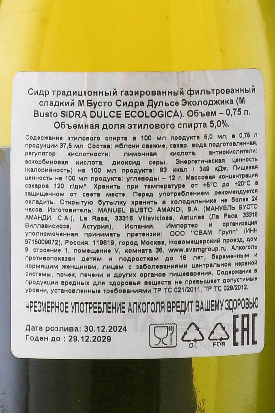 M.Busto Sidra Dulce Ecologica - сидр М.Бусто Сидра Дульсе Эколоджика 0.75 л газированный фильтрованный сладкий