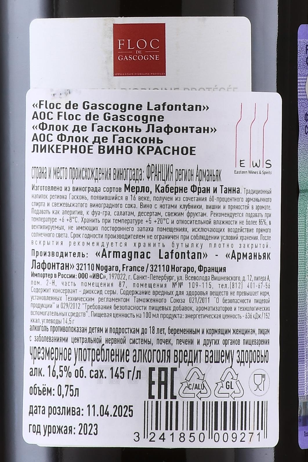 Красное ликерное вино Floc De Gascogne Lafontan от известной семейной компании из Франции, региона Гасконь, обладает крепостью 16,5 градуса и высокой сладостью: в литре напитка содержится 145 г сахара. Сок трех европейских сортов винограда смешали с молодым арманьяком и разлили по бутылкам, которые минимум 9 месяцев находились в погребах — это было необходимо для формирования сбалансированного богатого букета. Алкоголь имеет статус контролируемого по месту происхождения.