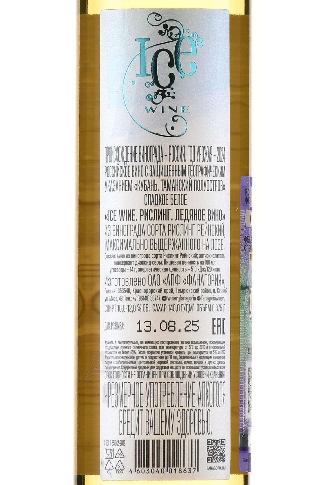 Белое сладкое вино Ice Riesling (Ледяное Рислинг) 0,375 л — изысканный напиток от российской компании Фанагория. Виноград для производства выращивается на Таманском полуострове, славящемся мягким климатом и минеральными почвами. Ягоды собирают вручную в замороженном виде при температуре от –7 до –10 °C, благодаря чему вино приобретает интенсивную сладость и сохраняет природную свежесть. Ферментация происходит медленно, при низких температурах, после чего напиток выдерживается в стальных ёмкостях несколько месяцев. Ice Riesling Fanagoria неоднократно удостаивалось высоких оценок винных критиков и завоёвывало награды на международных конкурсах.