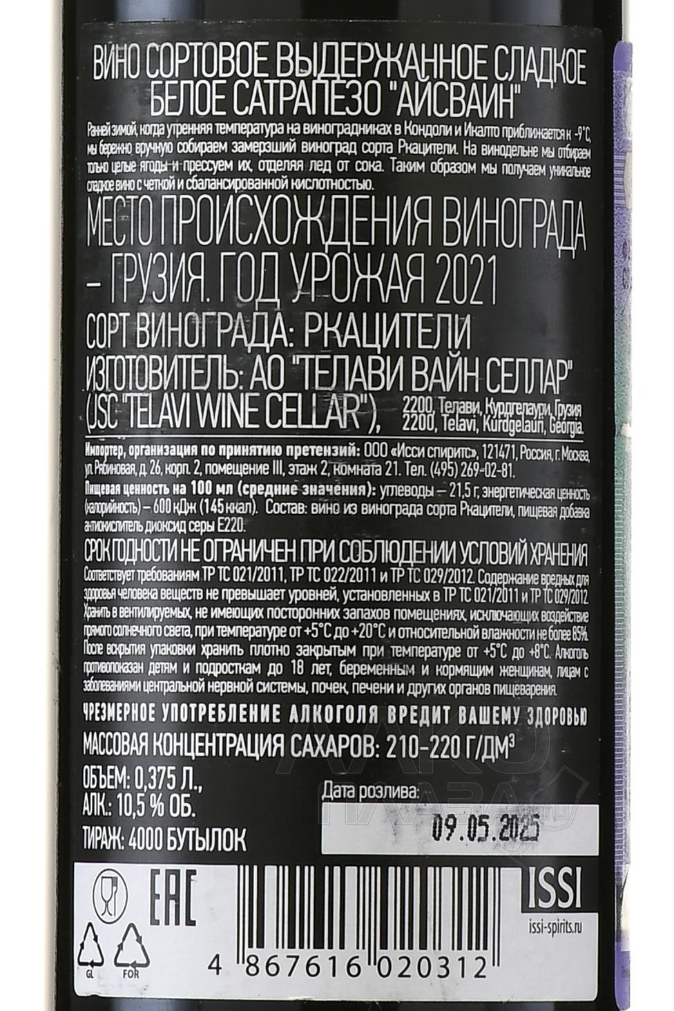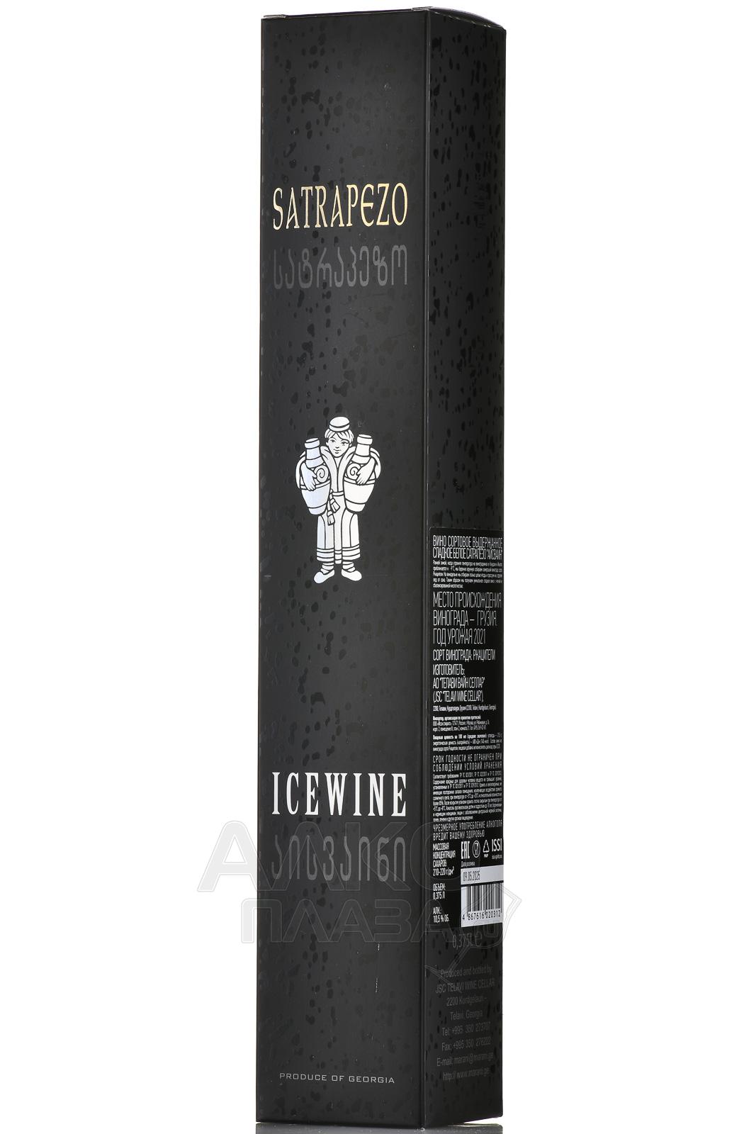 Белое сладкое вино Satrapezo Icewine 2019 год 0,375 л в п/у — очень необычное, интересное, заслуживающие внимание, отлично подходящее на роль подарка. Это айсвайн из Грузии, произведенный из самого распространенного белого сорта — автохтона Ркацители. Его выращивали в деревнях Кондоли и Икалто в Кахетии. Сбор ягод начинают после того, как утренняя температура на виноградниках опускается до -9 градусов. Замерзшие грозди бережно снимают с веток вручную, далее проводятся гребнеотделение, сортировка и мягкое прессование. Винификация протекает в стальных резервуарах с терморегуляцией. Вино выдерживалось в стали не менее 6 месяцев и было разлито в бутылки половинного объема, как и положено для айсвайнов (в Европе обычно используют half bottle).