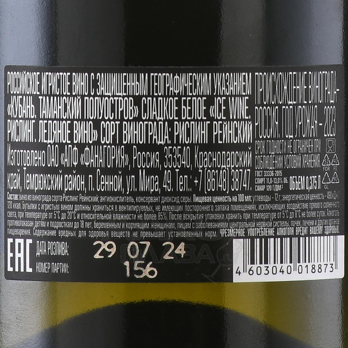 Игристое белое сладкое вино Fanagoria Ice Sparkling Wine Risling 0,375 л создано из винограда, выращенного на Таманском полуострове, где мягкий морской климат и известняковые почвы формируют свежий и насыщенный стиль вина. Урожай собирается поздней осенью, когда ягоды слегка подмораживаются, что позволяет сохранить концентрированную сладость и выразительную кислотность. Винификация резервуарным способом (метод Шарма) позволяет подчеркнуть чистоту аромата и легкость вкуса, а также придать напитку игристость. Уникальность заключается в сочетании стиля «айсвайн» с игристой структурой, что встречается редко и высоко ценится критиками. Вино получало награды на российских и международных конкурсах, что подтверждает его качество.