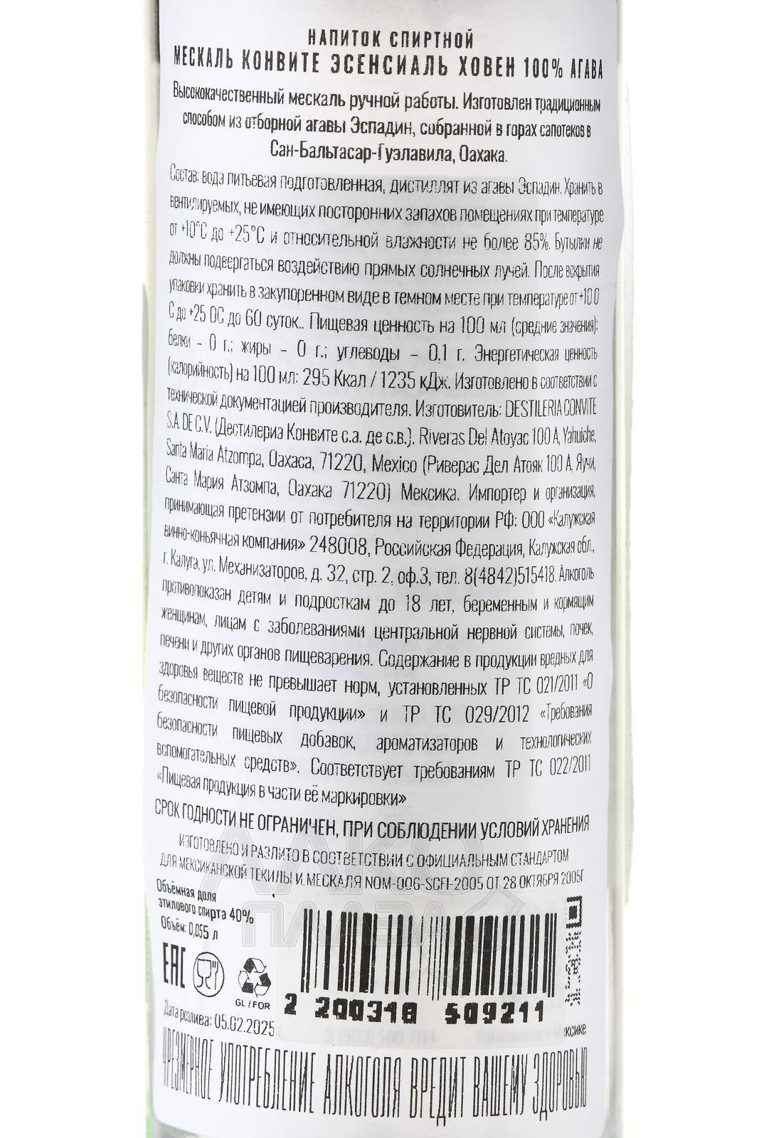 Мескаль Convite Esencial Joven 0,055 л производится в Мексике, на территории штата Оахака, в регионе с горным рельефом, сухим климатом и бедными почвами вулканического происхождения. Эти условия ограничивают урожайность агавы и усиливают концентрацию веществ в её сердцевине, что напрямую влияет на выразительность и чистоту стиля. Напиток создаётся по традиционной для зоны схеме. Пиньи запекают в земляных печах, после чего измельчают и сбраживают естественным образом без добавления промышленных культур дрожжей. Перегонка проходит в медных аламбиках. Категория ховен означает отсутствие выдержки в бочках, что подчёркивает ориентацию на сохранение исходного характера дистиллята и его терруарного происхождения.