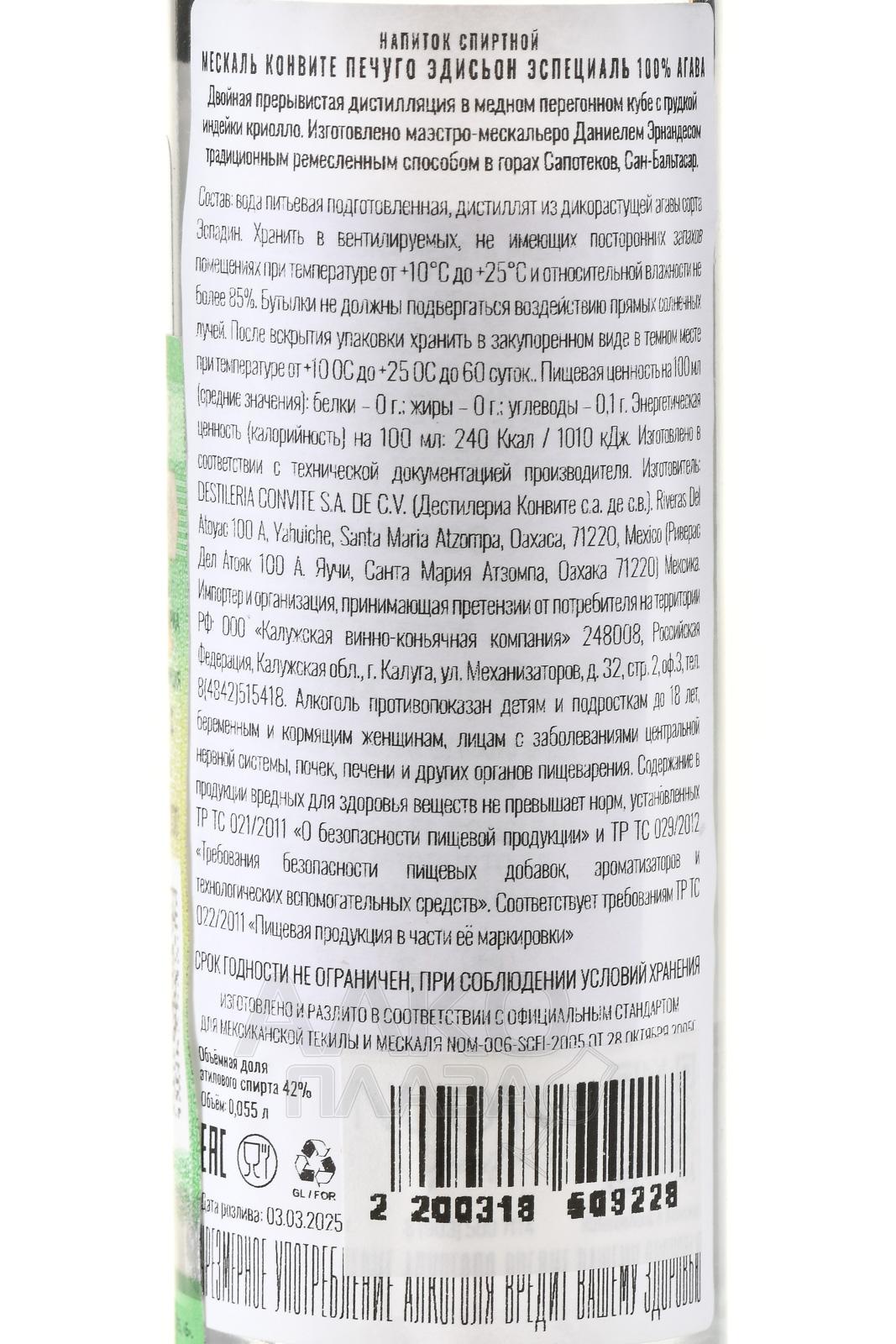 Мескаль Convite Pechuga Edicion Especial 0,055 л производится в Мексике, в штате Оахака. Сырьё собирают в дикой природе в регионе с горным рельефом, бедными каменистыми почвами и выраженной разницей дневных и ночных температур. Эти условия замедляют развитие агавы Эспадин и формируют её насыщённый, концентрированный профиль. Для этой версии используется традиционный оахакский подход, где важна связь местного климата и ручного труда, что напрямую отражается на характере напитка и его глубине.
