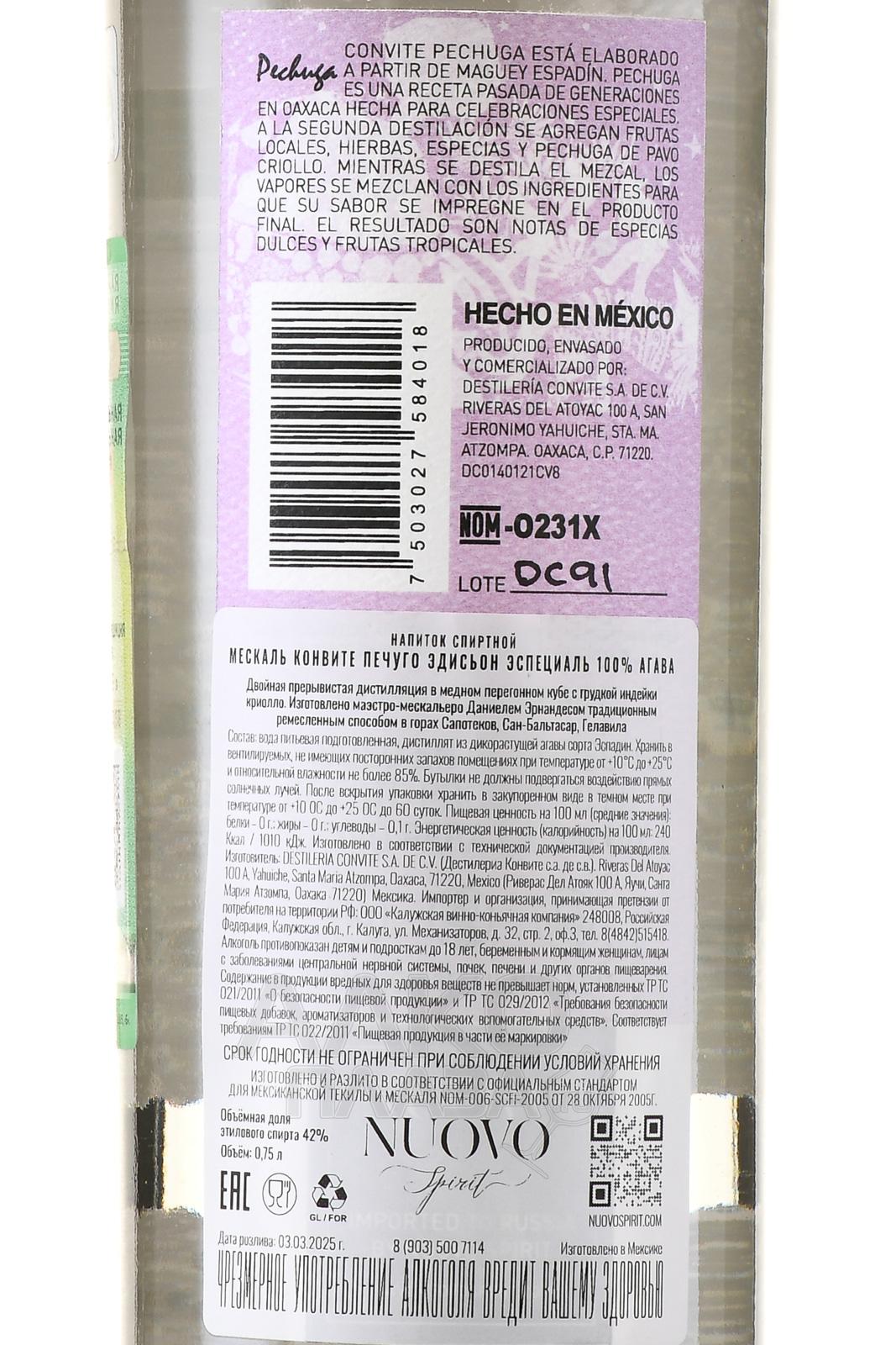Мескаль Convite Pechuga Edicion Especial 0,75 л происходит из мексиканского штата Оахака, из горной зоны, где в далёком прошлом жила могущественная индейская цивилизация сапотеков. Местность отличается скудными минеральными почвами и резкими суточными перепадами температур. Такие условия замедляют рост агавы и способствуют накоплению плотных соков, что формирует насыщенный и выразительный характер дистиллята. Производство основано на традиционной практике региона. Сердцевины диких плодов разновидности Эспадин запекают в подземных печах, затем измельчают и сбраживают без добавления промышленных дрожжей. Перегонка проводится дважды в медных кубах. Для версии печуга применяется дополнительный этап: во время финальной дистилляции внутрь аламбика подвешивают мясо местной индейки криолло. Выдержка в бочках не используется, чтобы сохранить природную структуру и первичную сложность напитка.