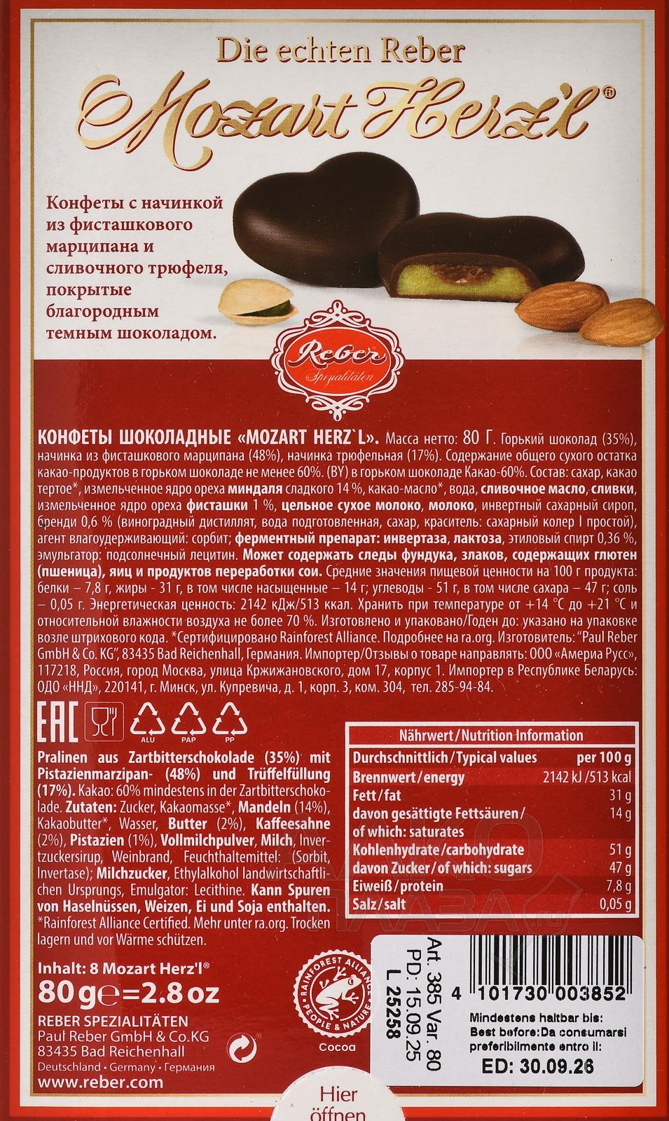 Шоколадные сердечки Ребер Моцарт 80 гр