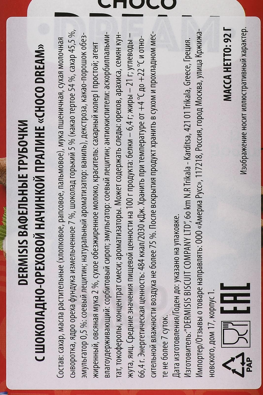 Трубочки вафельные Дермисис Чоко Дрим с шоколадно-ореховой начинкой 92 гр