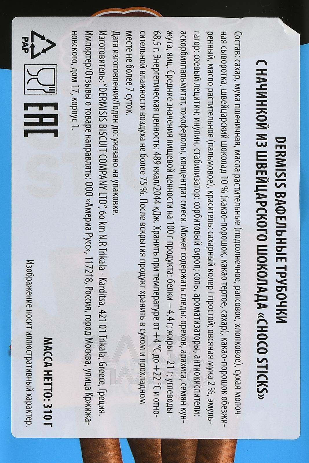 Трубочки вафельные Дермисис Чоко Стикс из Швейцарского шоколада 310 гр