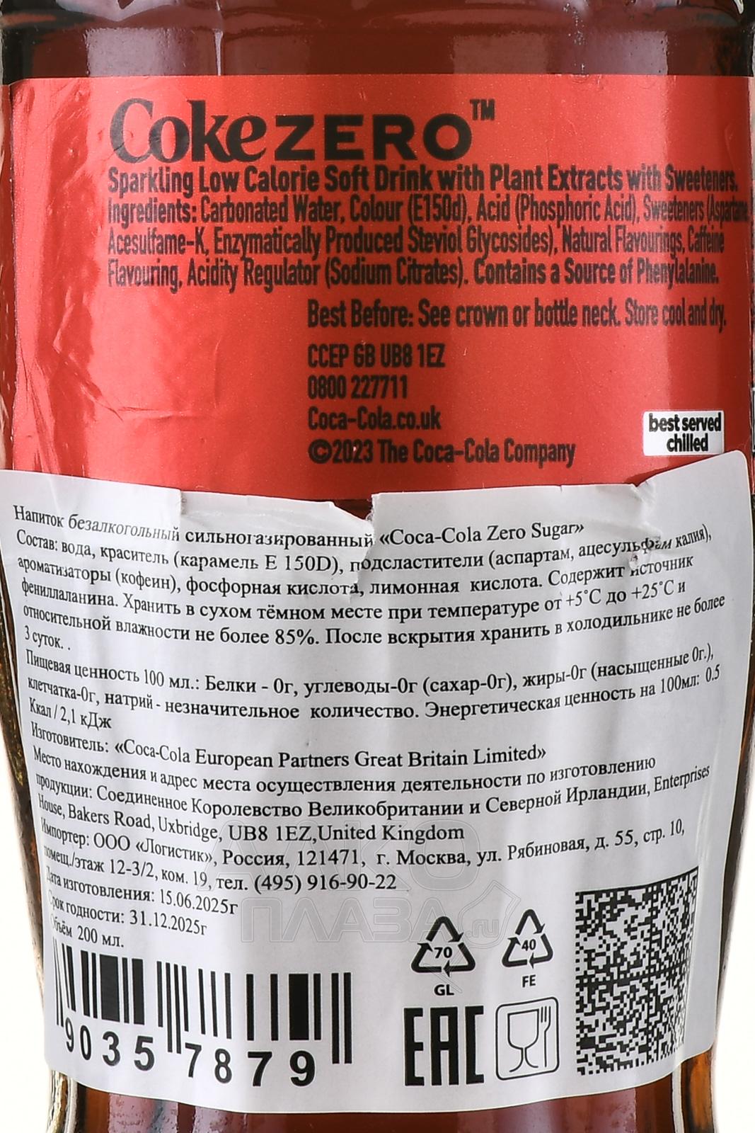 Coca-Cola Zero - напиток б/алк Кока-Кола Зеро 0.2 л стекло