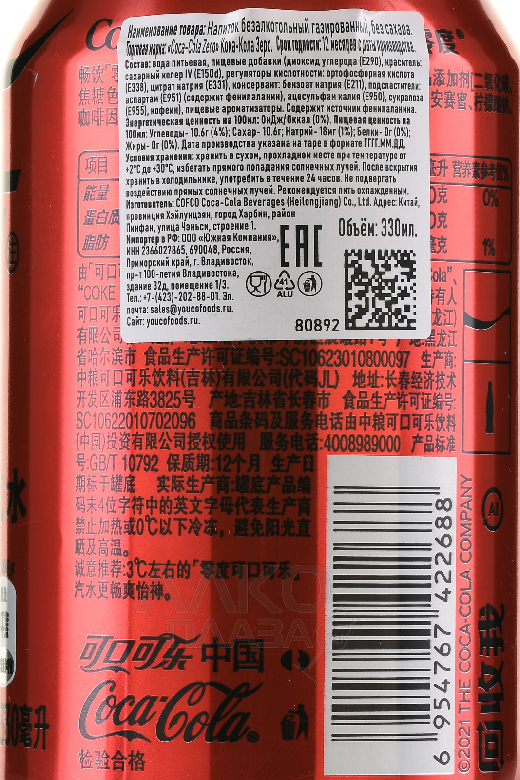 Coca-Cola Zero - напиток Кока-Кола Зеро 0.33л ж/б Китай