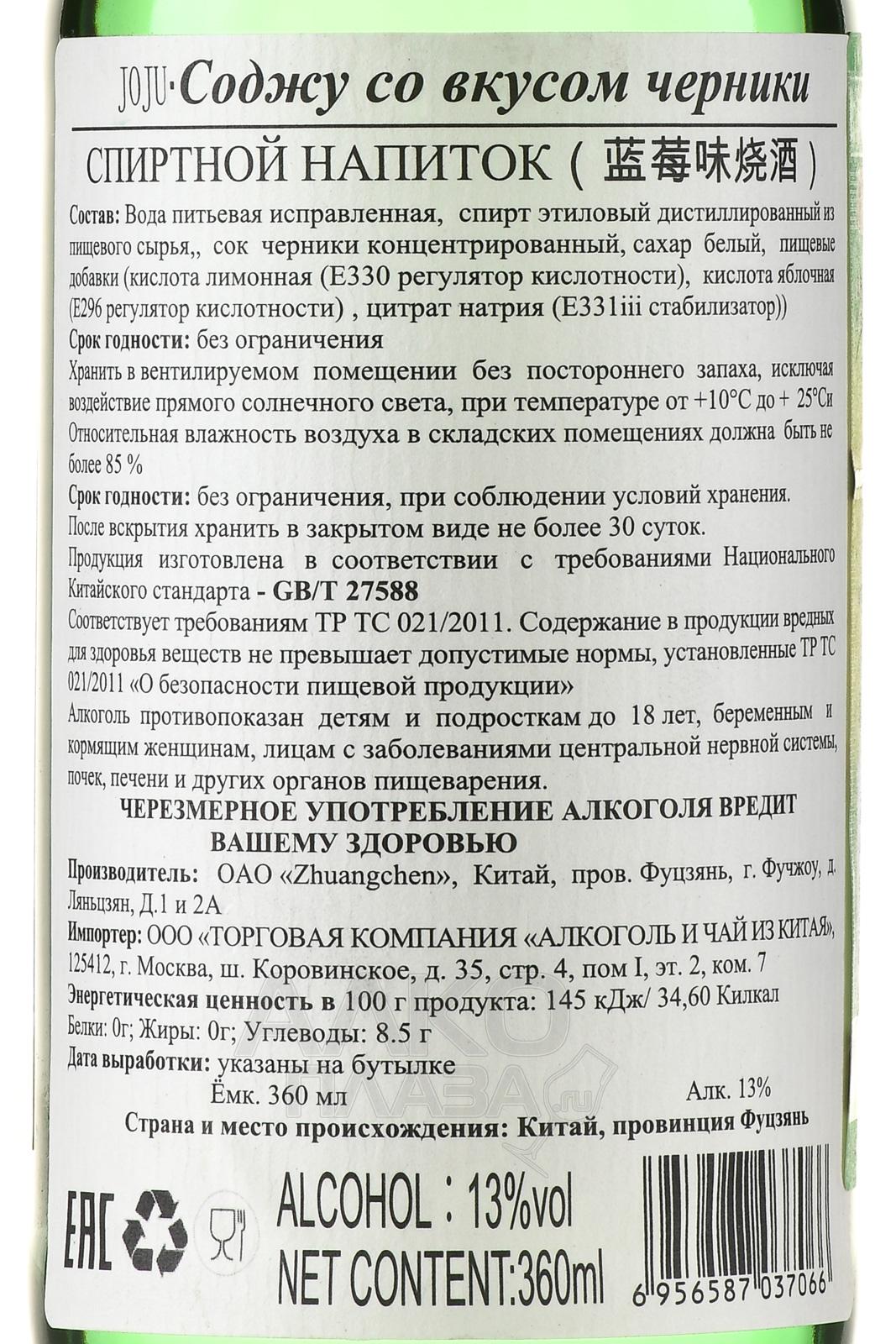 Соджу Joju Soju Blueberry 0,36 л — современный напиток, созданный на основе традиционного рецепта, но с акцентом на яркий ягодный вкус. Производится из очищенного этилового спирта, полученного путем ферментации риса, ячменя и пшеницы. После перегонки напиток проходит тщательную фильтрацию, что придаёт ему мягкость и чистоту. В процессе производства добавляется сок черники, благодаря которому купаж получает насыщенный вкус и лёгкий фруктовый аромат. Алкогольная крепость снижена до 13%, что делает этот соджу лёгким и доступным для дегустации в охлаждённом виде.
