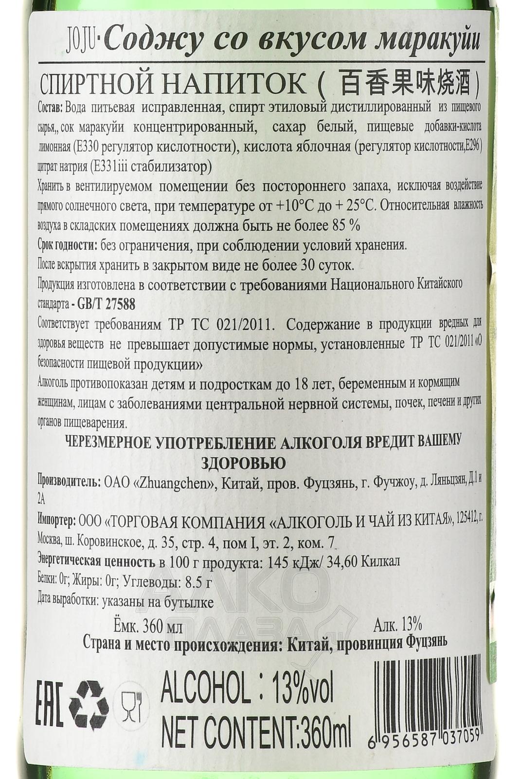 Соджу Joju Soju Passion Fruit 0,36 л — современное южнокорейское спиртное, которое сочетает легкость классического варианта с ярким фруктовым акцентом маракуйи. Производитель использует очищенный дистиллированный спирт на основе риса и ячменя, выращенных в долинах с мягким климатом и плодородными песчано-глинистыми почвами. Фруктовый сок добавляется после дистилляции, чтобы сохранить натуральные ароматы и свежесть. Напиток отличается мягкой текстурой, сбалансированной сладостью и умеренной крепостью, что делает его универсальным для употребления в чистом виде и для смешивания в коктейлях. Производство строго контролируется, а фильтрация через активированный уголь обеспечивает прозрачность и чистоту вкуса, сохраняя яркий характер.