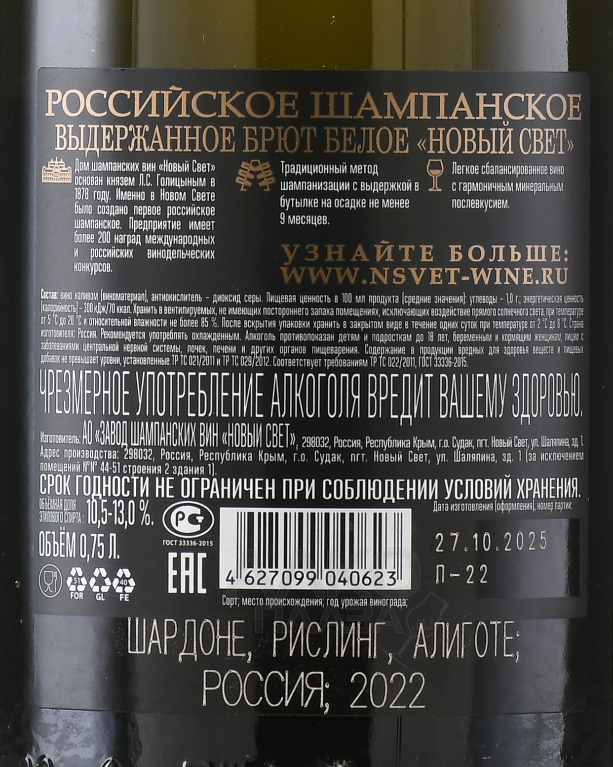 Вино игристое Новый Свет Выдержанное брют белое 0.75 л
