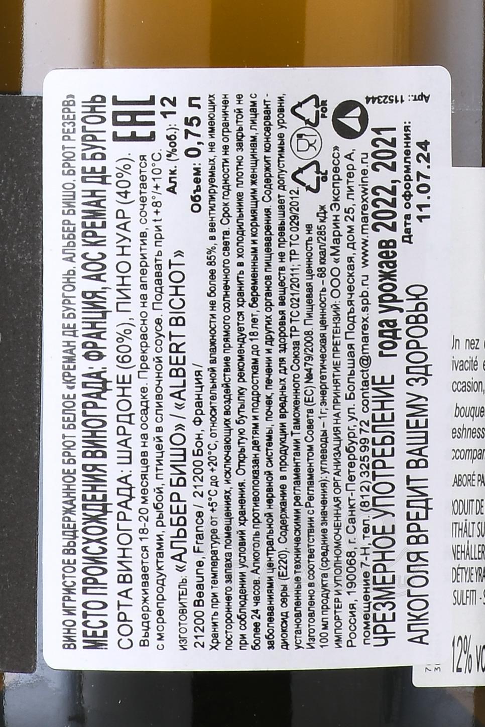 Бело сухое игристое вино Albert Bichot Cremant de Bourgogne Brut Reserve 0,75 л - прекрасный пример отлично структурированного напитка, который способен стать конкурентом из Шампани. Производится исключительно из традиционных бургундских сортов винограда. После первой ферментации игристое вино выдерживают 6 месяцев, причем 10% выдерживается в дубовых бочках. Созревание в бутылке проходит от 18 до 20 месяцев в подвалах винодельни.