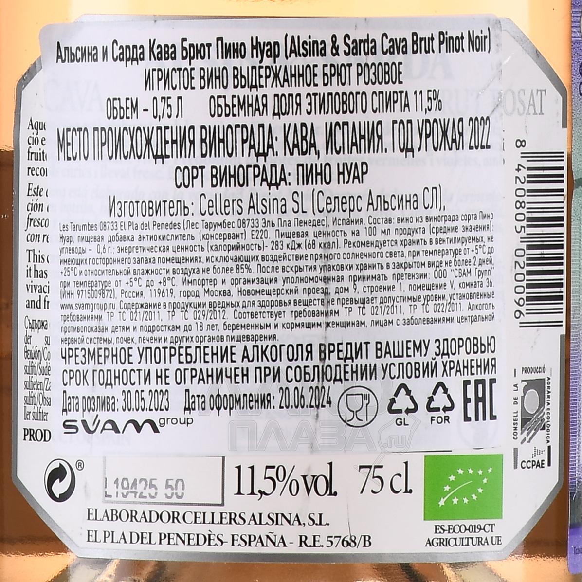 Игристое розовое вино брют Alsina & Sarda Cava Brut Pinot Noir 0,75 л — это испанская кава, произведенная по традиционному методу во владениях семейной винодельни в регионе Пенедес. Для винификации был использован красный виноград популярного мирового сорта. Его ягоды вырастили на известняковых почвах в умеренном климатом, где теплое лето и прохладные ночи способствуют медленному развитию плодов. После краткой мацерации сусла с кожицей для извлечения цвета и аромата, напиток прошло первичную ферментацию в стали и вторичную — в бутылках, после чего выдерживался на осадке не менее 9 месяцев.