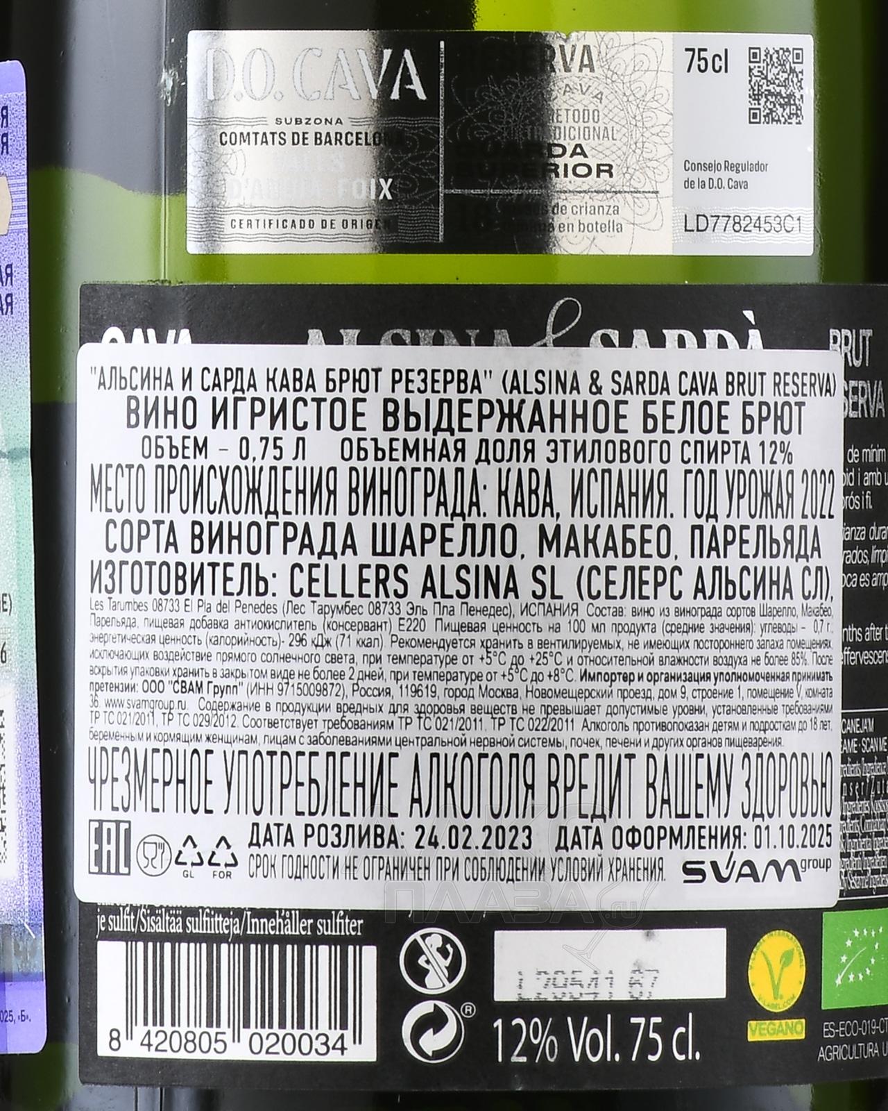 Игристое белое вино Alsina & Sarda Cava Brut Reserva 0,75 л – органический брют из испанского региона Пенедес, знаменитого своими шипучими купажами. Напиток представлен смесью традиционных местных сортов ягод, которые после сбора с лоз возрастом старше 20 лет подвергли переработке по классической технологии. Путем легкого прессования из плодов отжали сок, который затем сначала ферментировали при низкой температуре в стали, а затем сбраживали в бутылках с последующей выдержкой на протяжении 20-24 месяцев.