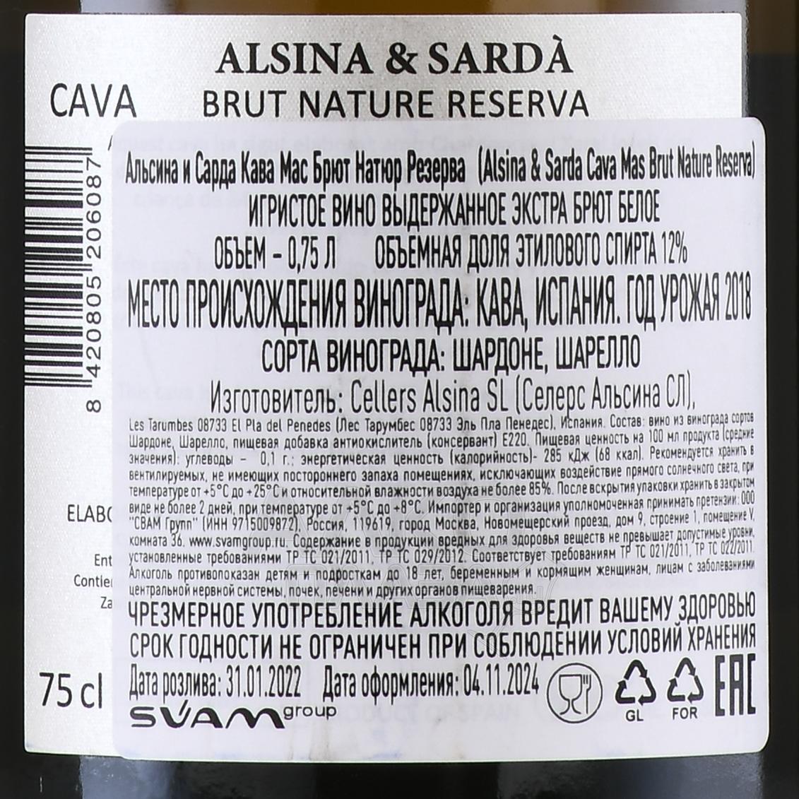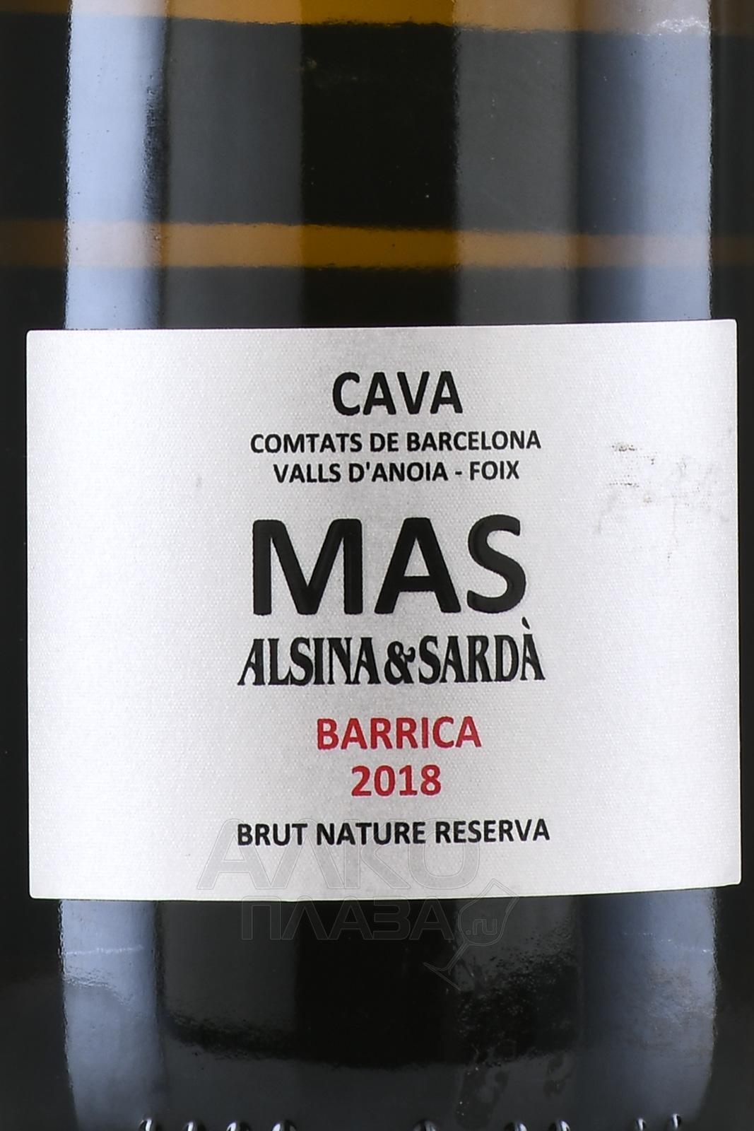 Игристое белое вино брют-натюр Alsina & Sarda Cava Mas Brut Nature Reserva 0,75 л получено в регионе DO Cava в испанской Каталонии. Виноград для винификации вырастили на органических участках в Пенедесе, где преобладают известняковые и глинистые почвы. Процесс производства протекал по шампанскому методу с вторичной ферментацией в бутылке и выдержкой на осадке от 20 до 24 месяцев.
