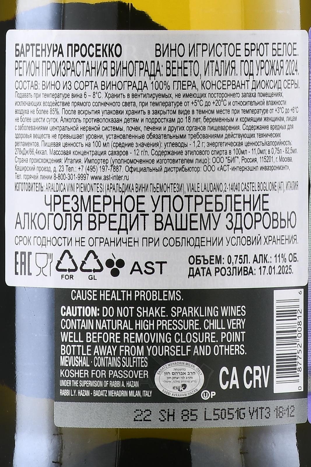 Игристое вино Bartenura Prosecco 0,75 л рождено на северо-востоке Италии, в регионе Венето. Этот терруар известен известняковыми почвами и мягким климатом с умеренным количеством осадков. Производство проходило по методу Шарма, при котором вторичная ферментация осуществляется в стальных резервуарах под давлением, что помогает сохранить естественные ароматы и легкость. Игристое вино не выдерживалось, что характерно для уникального стиля Просекко.