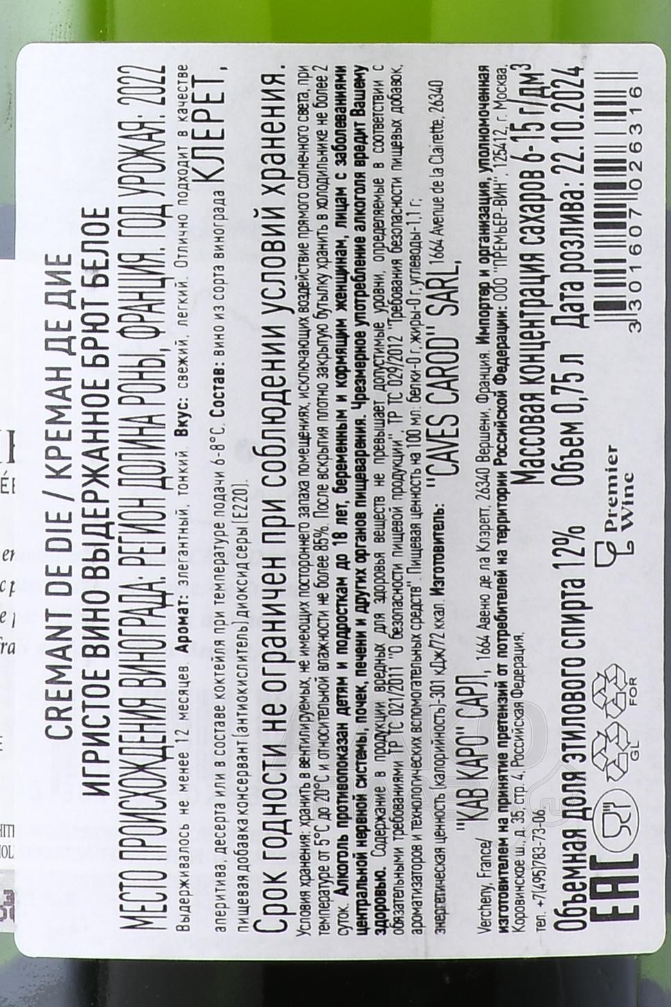Игристое белое вино брют Carod Cremant de Die 0,75 л — напиток из региона Дром, расположенного в юго-восточной части страны, в долине реки Дром у подножия Предальп. Зона производства относится к апелласьону, который официально признан в конце XX века. Терруар формируется сочетанием горного рельефа, известняково-глинистых почв и прохладного климата с заметными суточными перепадами температур. Эти условия способствуют сохранению высокой естественной кислотности винограда и формированию свежего, точного стиля с умеренной ароматической интенсивностью.