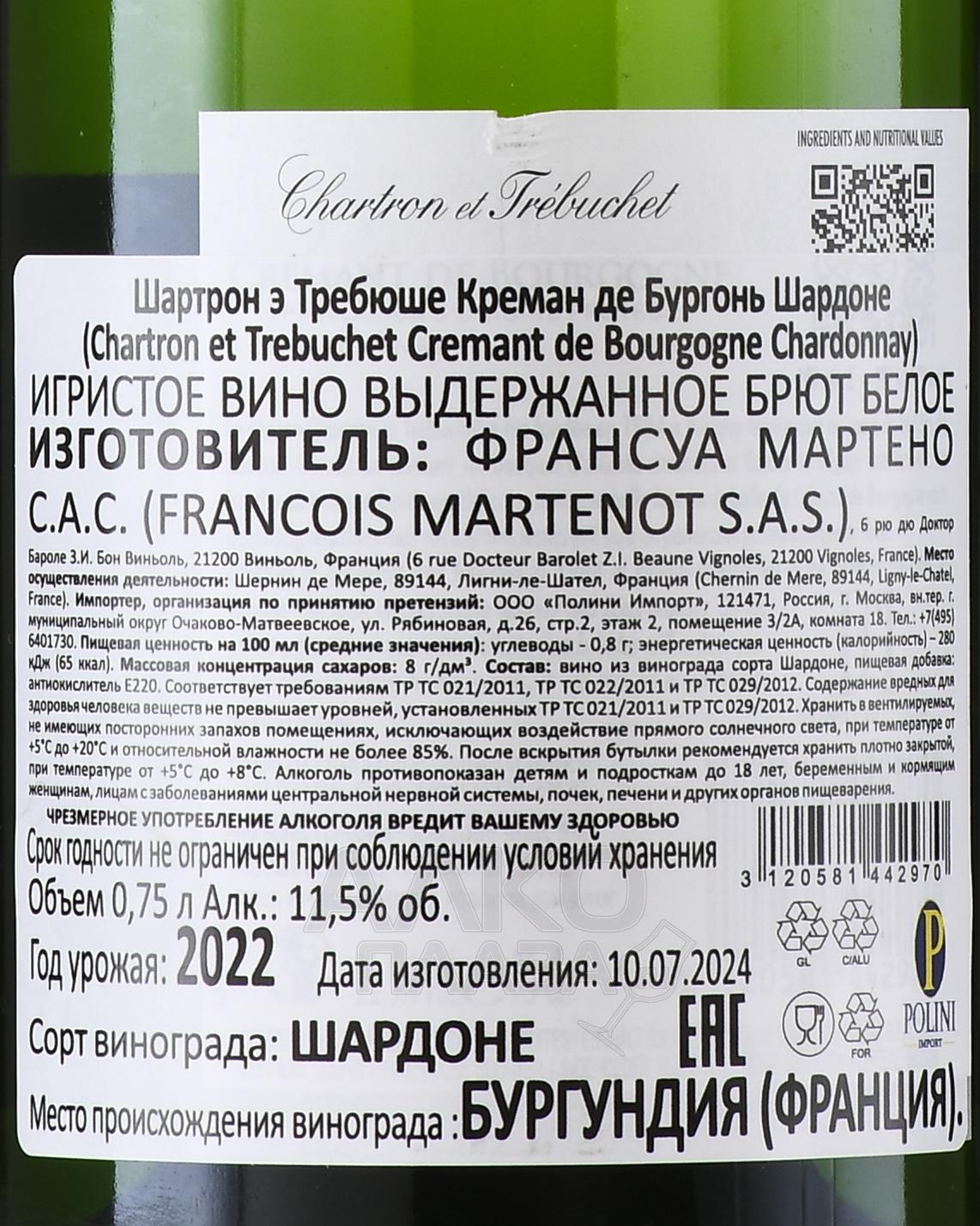Игристое белое вино брют Chartron et Trebuchet Cremant de Bourgogne Chardonnay 0,75 л – одна из традиционных вариаций великого региона Бургундия. Спиртное представлено сортом винограда, распространенным не только во Франции, но и во всем мире. Винификация проходила классическим способом – ягоды прессовали, полученный сок после декантации перелили в стальные чаны, где прошло первое брожение при контролируемой низкой температуре. В сброженное сусло добавили дозажный ликер из смеси вина того же сорта и небольшого количества сахара и разлили по бутылкам для второго этапа ферментации и старения на тонком осадке.