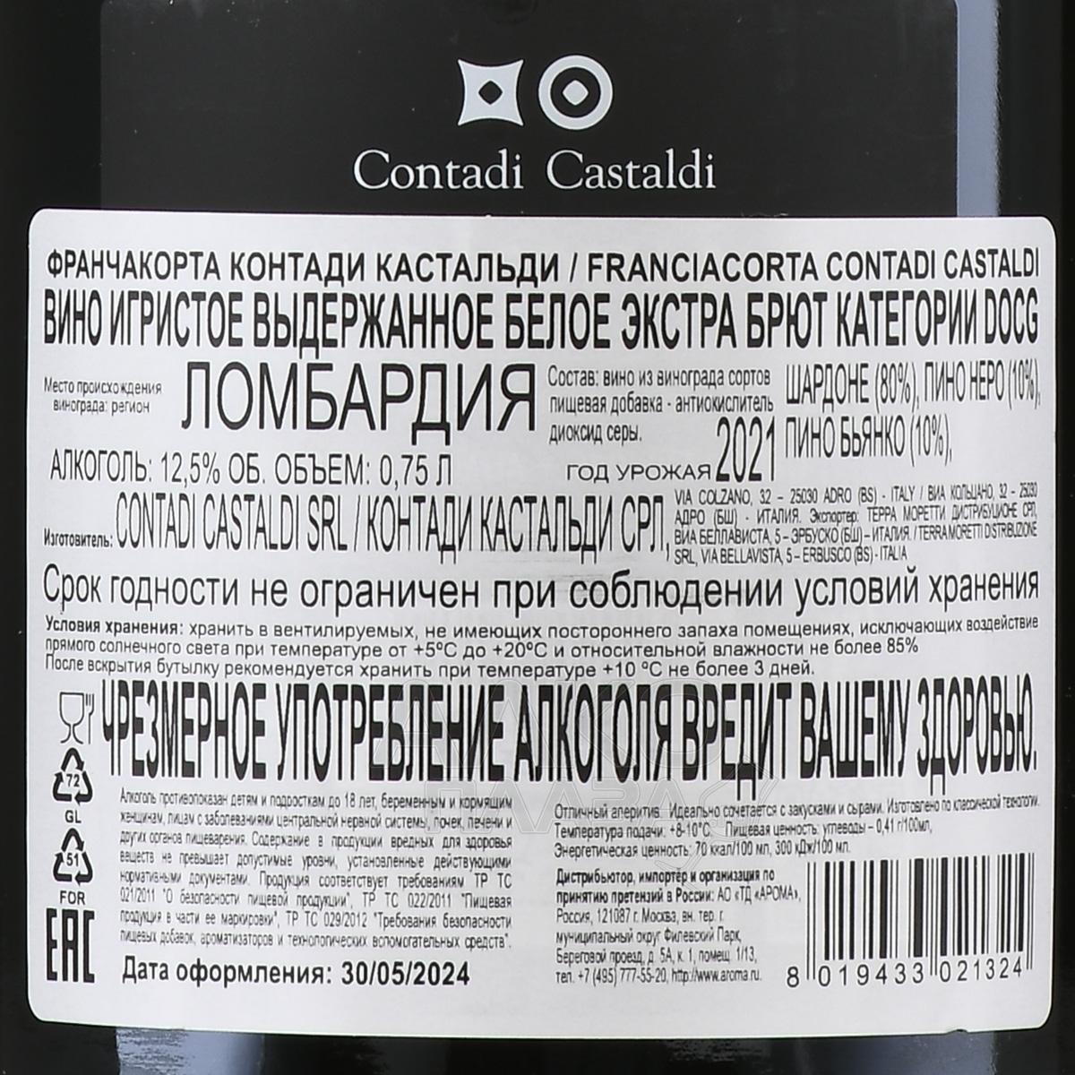 Игристое белое вино экстра-брют Contadi Castaldi Franciacorta 0,75 л в п/у — это образец итальянского виноделия, сочетающий традиции и современность. Созданное в регионе Франчакорта между озером Изео и городом Брешиа, оно отражает особенности местного терруара: минеральные почвы, сформированные ледниковыми отложениями, и умеренный климат, способствующий равномерному созреванию винограда. Виноград собирается вручную на пике зрелости, после чего прессуется, а сок из него проходит двойную ферментацию со вторым брожением в бутылках по классическому методу и выдержкой на тонком осадке около 30 месяцев.