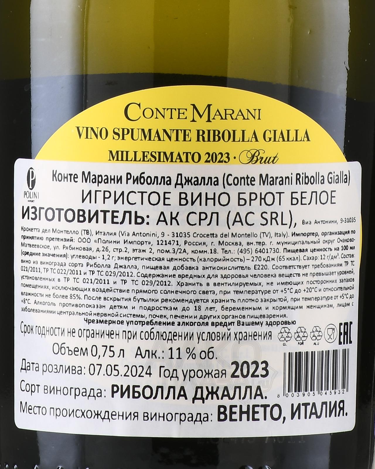 Conte Marani Ribolla Gialla Spumante Millesimato - вино игристое Конте Марани Риболла Джалла Спуманте Миллезимато 0.75 л белое брют