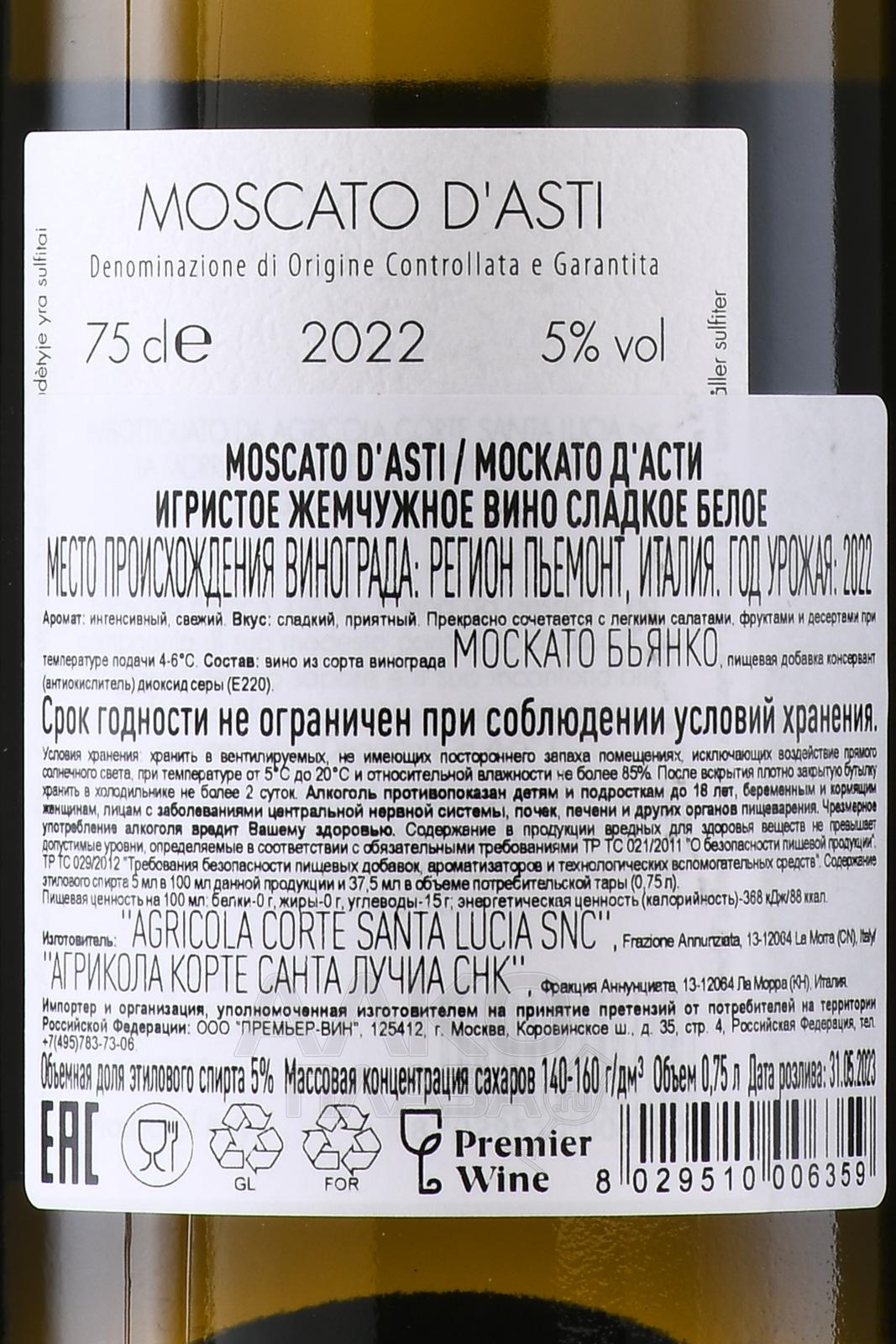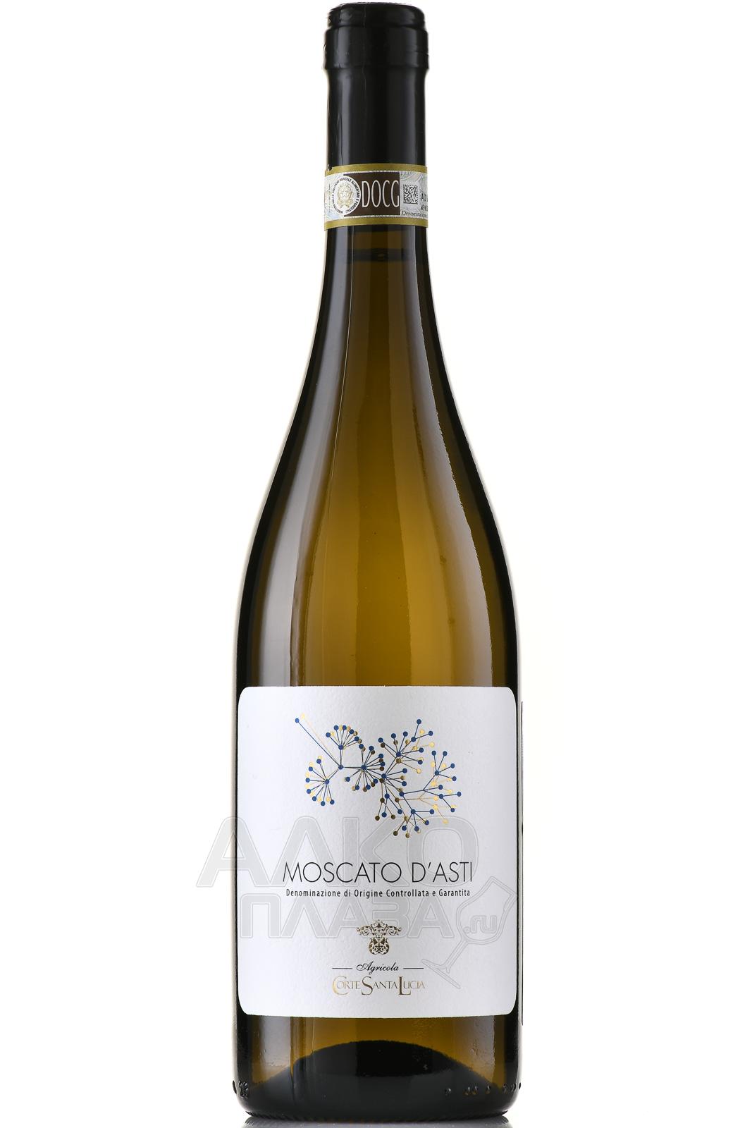 Игристое белое сладкое вино Corte Santa Lucia Moscato d`Asti 0,75 л происходит из Пьемонта, с холмов на юге региона. Виноградники находятся на склонах с известняково-глинистыми и мергелевыми почвами, которые хорошо удерживают влагу и подчёркивают ароматический профиль сорта. Умеренно прохладный климат и значительные суточные перепады температур способствуют сохранению свежести и естественной кислотности. Напиток делают из ароматного винограда позднего сбора. Ферментация проходит по методу Шарма. Первое брожение останавливают принудительно, чтобы сохранить остаточный сахар, а повторно напиток ферментируют в стальных автоклавах при пониженном давлении до 2,5 атмосфер.