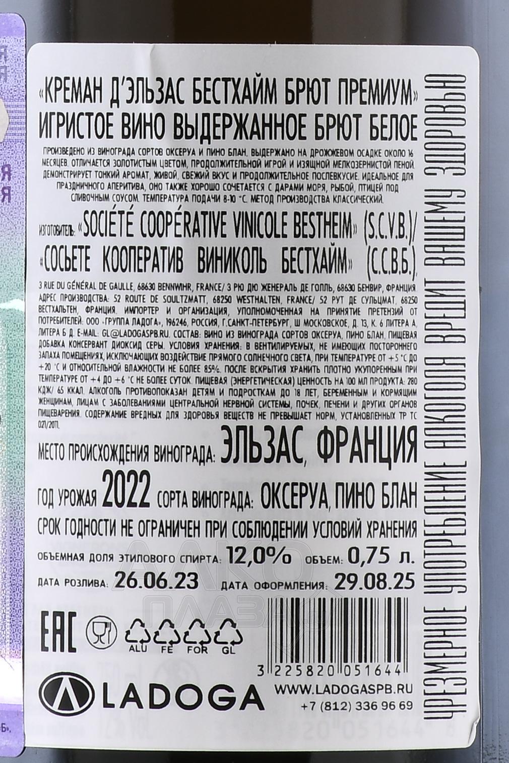 Cremant d’Alsace AOC Bestheim Brut Premium - вино игристое Креман д Эльзас Бестхайм Брют Премиум 0.75 л в п/у