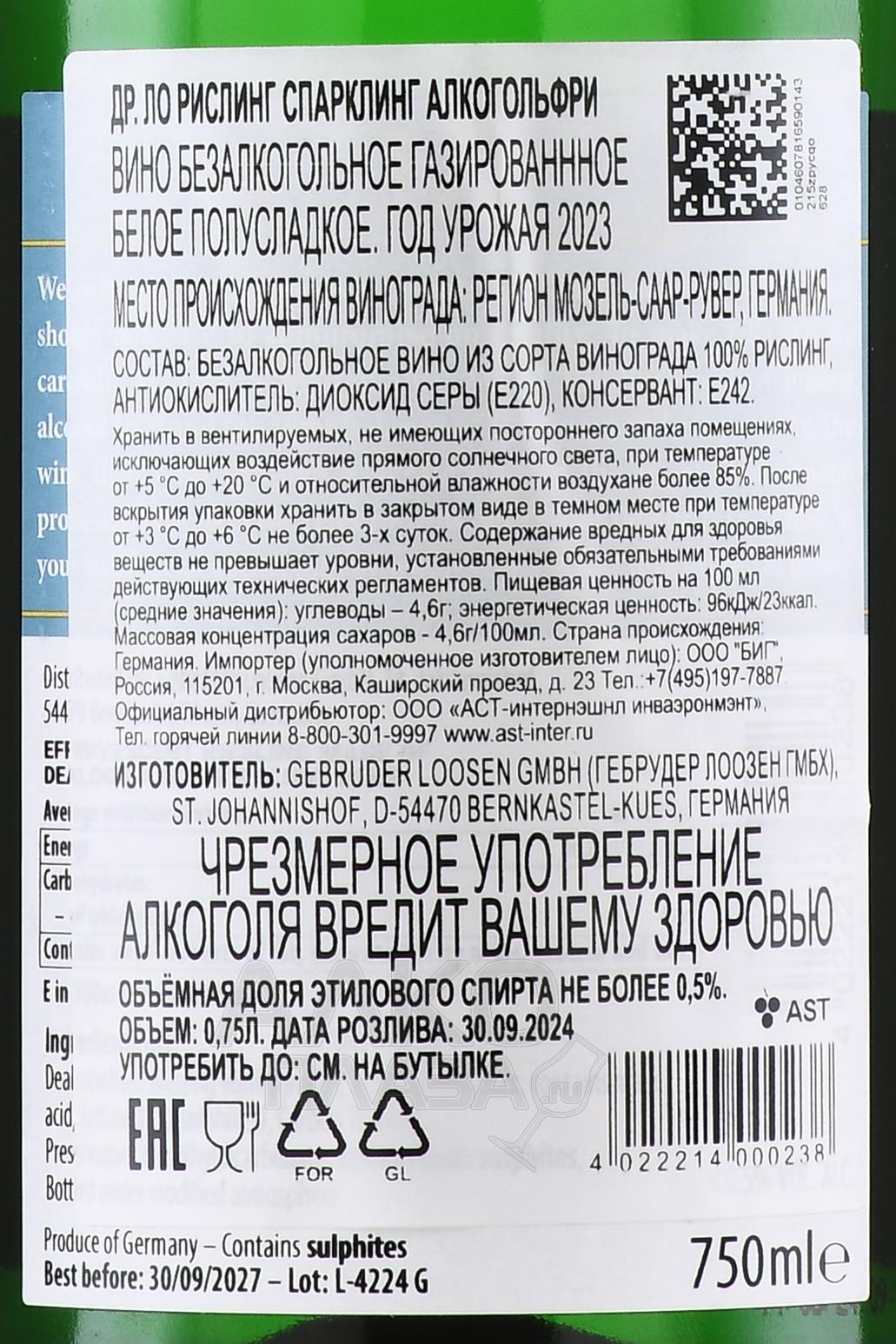 Dr. Lo Riesling Alcohol Free - вино игристое безалкогольное Др. Ло Рислинг 0.75 л белое полусладкое
