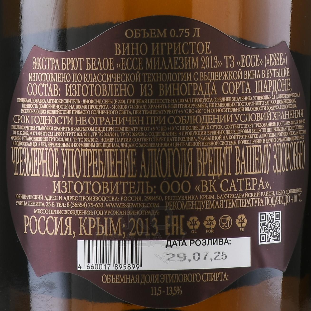 Вино игристое ТЗ ЕССЕ Миллезим Зеро Дозаж 0.75 л белое экстра брют в п/у