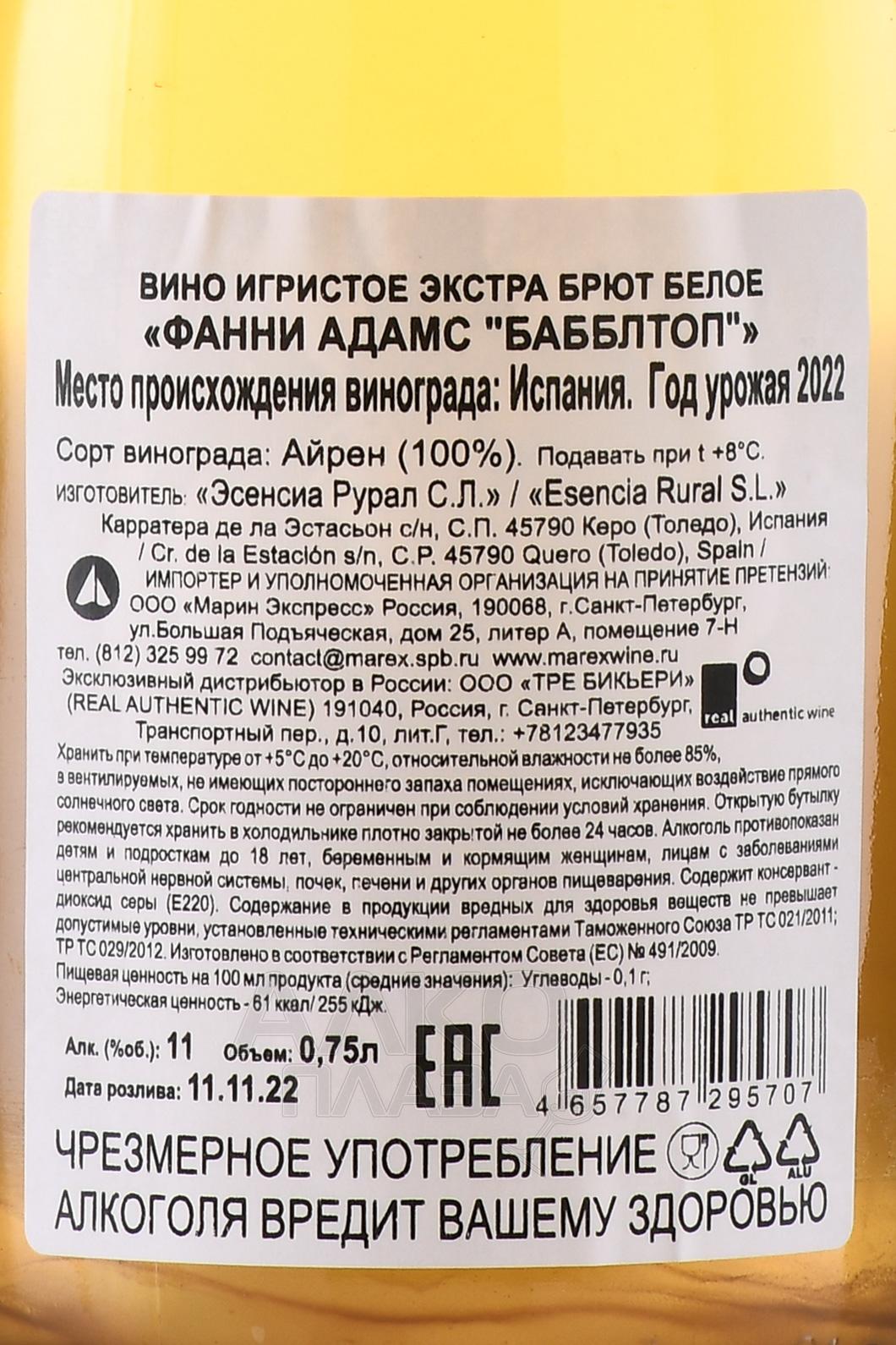 Игристое белое вино Fanny Adams Bubbletop 2020 г. 0,75 л – элегантный экстра-брют, который придется по вкусу ценителям натуральных спиртных напитков. Сырье для винификации собрали с обрабатываемых вручную виноградников в испанском регионе Ла-Манча. В погребе сусло подвергли продолжительной спонтанной ферментации на диких дрожжах. Дальнейшая выдержка проводилась уже в бутылках.