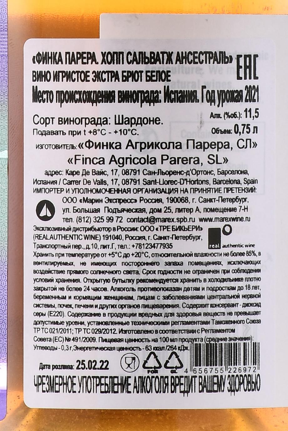 Finca Parera HOPP Salvatge Ancestral - вино игристое Финка Парера ХОПП Сальватж Ансестраль 0.75 л белое экстра брют