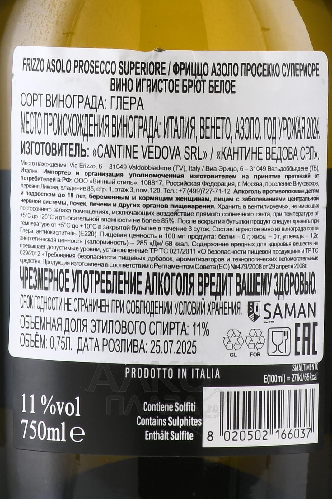 Frizzo Asolo Prosecco - вино игристое Фриццо Азоло Просекко Супериоре 0.75 л белое брют
