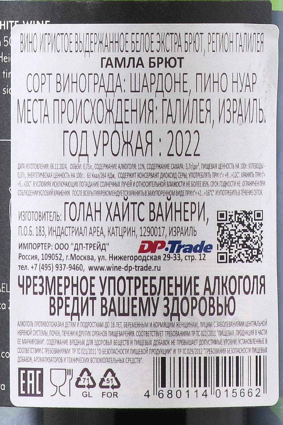 Игристое вино Gamla Brut 0,75 л — премиальный экстра брют, созданный в классическом стиле с акцентом на свежесть и минеральность. Виноград для производства выращивают на Голанских Высотах, где прохладный климат и вулканические почвы создают идеальные условия для медленного созревания ягод. Винификация осуществлялась по традиционному шампанскому методу: прессование целых гроздей, брожение в стали, потом в бутылке и выдержка на осадке не менее 12 месяцев. Это современное израильское игристое вино отражает точность технологии и уникальный характер терруара.