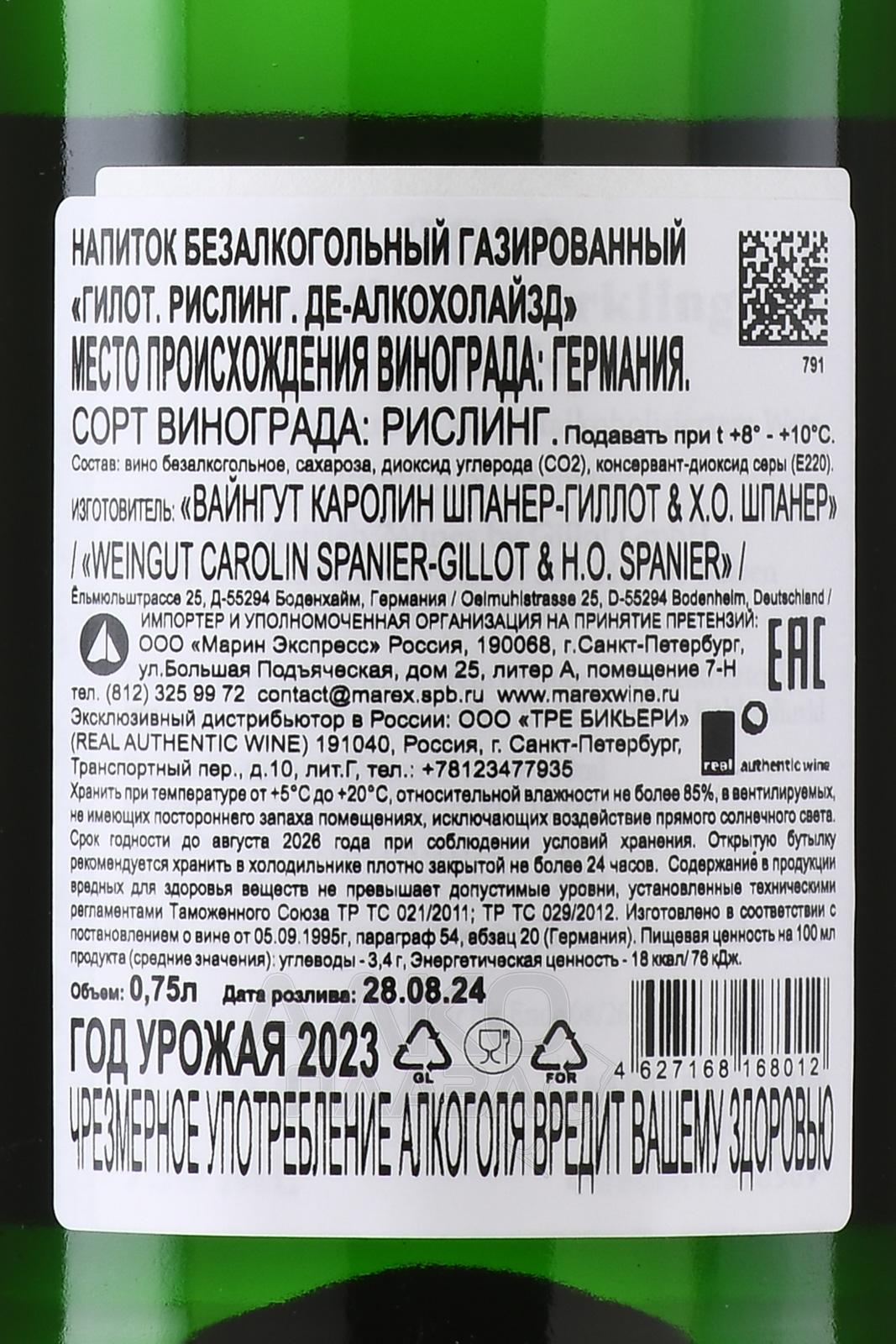 Безалкогольное вино Gillot Riesling De-alcoholized 0,75 л производится из белого сорта Рислинг, который выращивается на биодинамическом винограднике в регионе Рейнгессен на юго-западе Германии, в долине реки Рейн. Его собрали на пике спелости и винифицировали по классической технологии. Вино выдерживалось на тонком осадке 9 месяцев и также прошло дополнительную щадящую обработку для снижения уровня алкоголя до 0%. При этом безалкогольный газированный напиток полностью сохранил свою уникальную органолептику и выдающиеся дегустационные характеристики. Кролик на этикетке символизирует натуральность и гармонию с природой.
