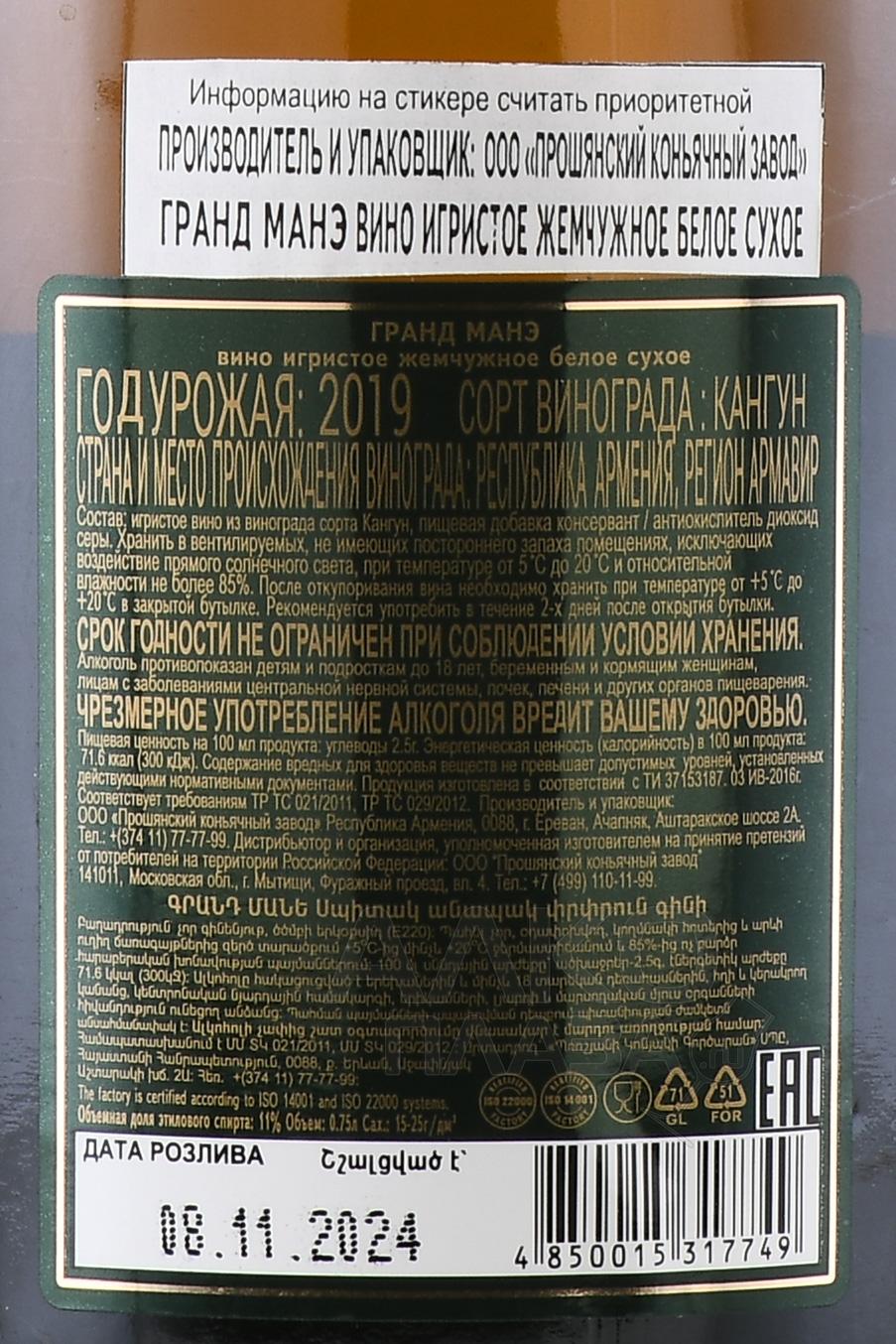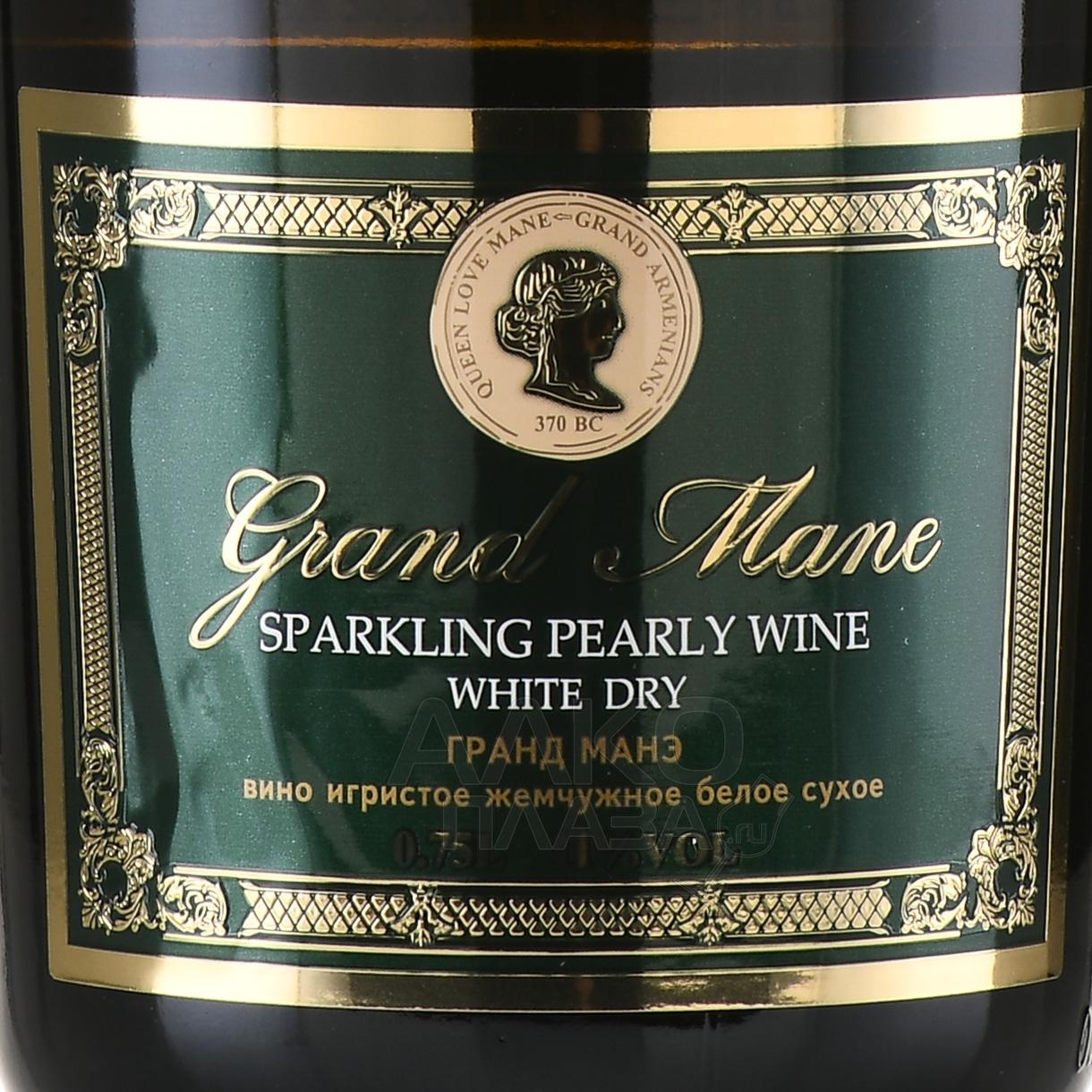 Игристое жемчужное белое сухое вино Grand Mane 0,75 л — элегантное, с тонким характером. Виноград для него выращивается в умеренном климате региона Армавир, на почвах, богатых минералами. Это обеспечивает сбалансированную кислотность и свежесть. Ферментация осуществлялась в стальных резервуарах по традиционной технологии, что сохранило ароматику автохтонного сорта Кангун. Жемчужное вино является малоигристым, у него чистый, мягкий вкус. Сухое Grand Mane получило признание на международных конкурсах и входит в рейтинги лучших игристых вин Армении.