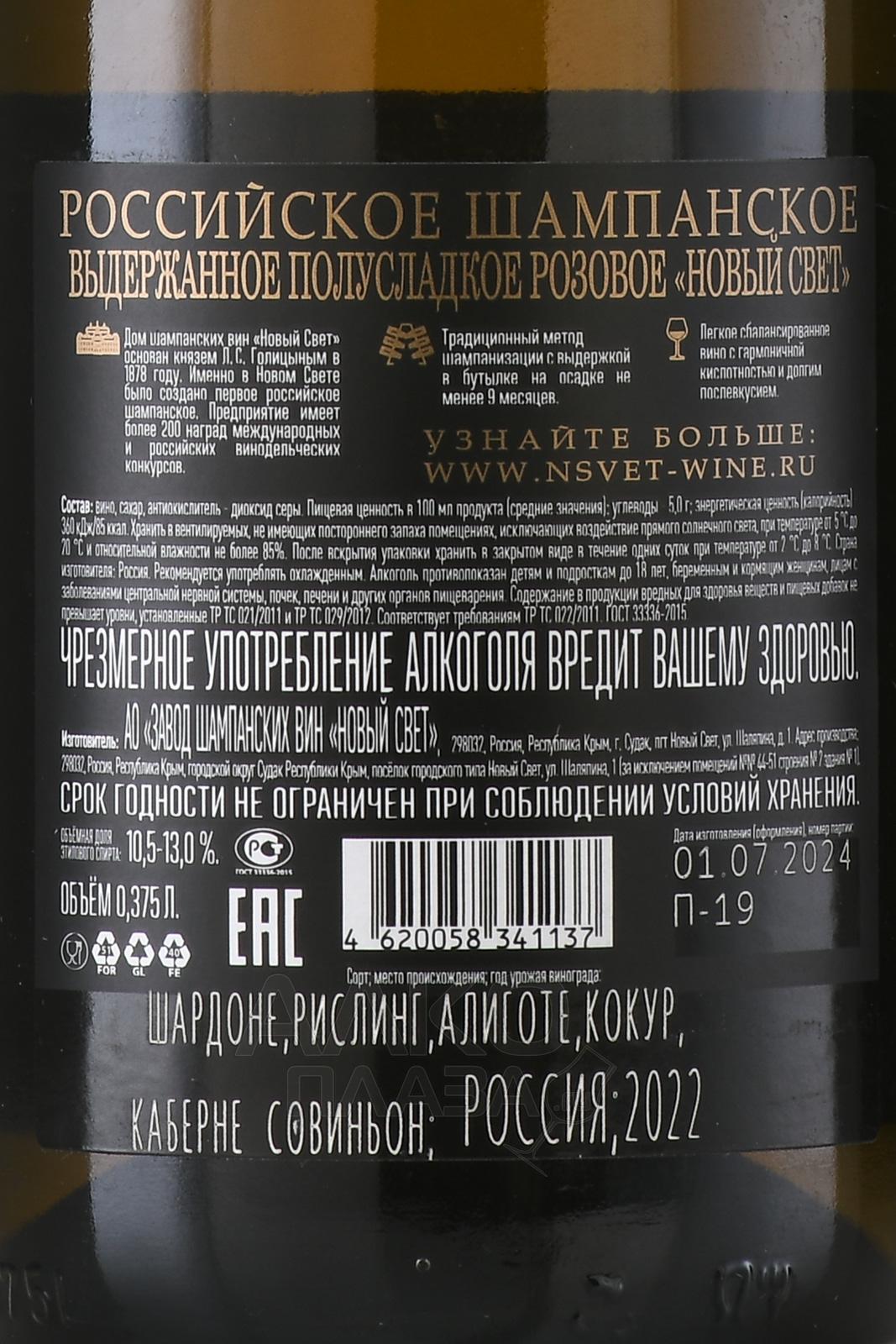 Игристое розовое полусладкое вино Новый Свет Выдержанное 0,375 л представляет винодельческий регион Крыма, известный своими уникальными климатическими условиями и подходящим терруаром для выращивания качественного винограда. Сезон сбора урожая был отмечен умеренно теплым летом с достаточным количеством солнечных дней и сухой осенью, способствовавшей равномерному созреванию ягод и концентрации сахаров. Напиток создали традиционным методом шампенуаз с вторичным брожением непосредственно в бутылках. Затем в течение минимум 9 месяцев купаж выдержали на дрожжевом осадке, благодаря чему он приобрел характерную тонкость пузырьков, насыщенность и богатую структуру. Небольшой формат бутылки удобен для индивидуальной дегустации и подачи в небольших компаниях.