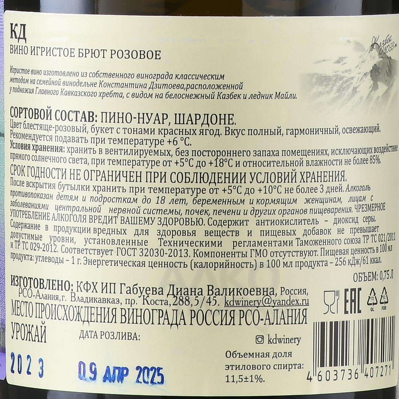 Вино игристое розовое KD Брют VI Классическим методом 0,75 л изготовлено традиционным методом, разработанным мастерами Шампани. Напиток представляет собой купаж из красного и белого винограда, собранного в районе станицы Голубицкая Темрюкского района Краснодарского края. Темнокожие ягоды кратковременно мацерировали, а затем сусло из обоих сортов ферментировали в стальных емкостях при контролируемой низкой температуре. Дальнейший процесс производства шел в стекле, где спиртное насыщалось углекислым газом. Выдержка на осадке заняла как минимум 18 месяцев. Брют предлагается в бутылках, украшенных вручную художницами винодельни.