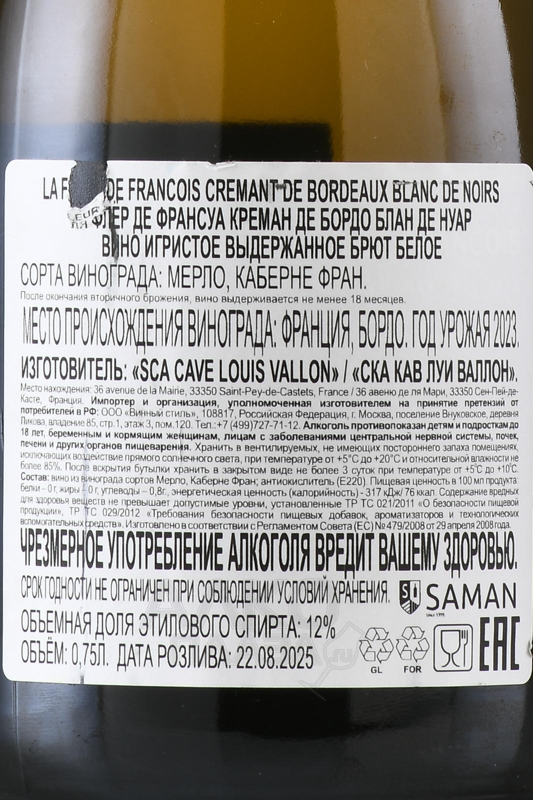 Игристое вино La Fleur de Francois Cremant de Bordeaux Blanc de Noirs 0.75 л создается по классической технологии, согласно которой вторичное брожение проходит непосредственно в бутылке в течение 12 месяцев, формируя изящный перляж и тонкую текстуру. Для производства используется виноград сортов Каберне Фран и Мерло, выращенный на глинисто-известняковых почвах Бордо, придающих напитку структуру и выразительность. Урожай собирают вручную в момент оптимальной зрелости и аккуратно транспортируют в небольших ящиках, чтобы сохранить целостность ягод. После мягкого прессования целых гроздей следует ферментация в стальных резервуарах с контролем температуры, позволяющая сохранить чистоту фруктового профиля и баланс. Завершающий этап дегоржажа подчеркивает элегантность и сложность напитка.