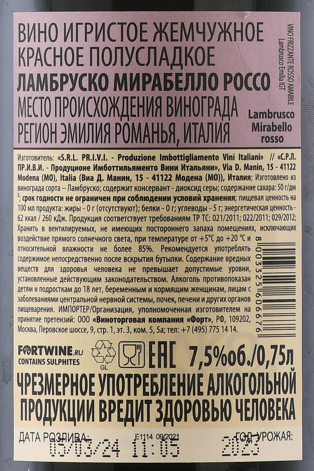 Lambrusco Mirabello Rosso - вино игристое Ламбруско Мирабелло Россо 0.75 л красное полусладкое
