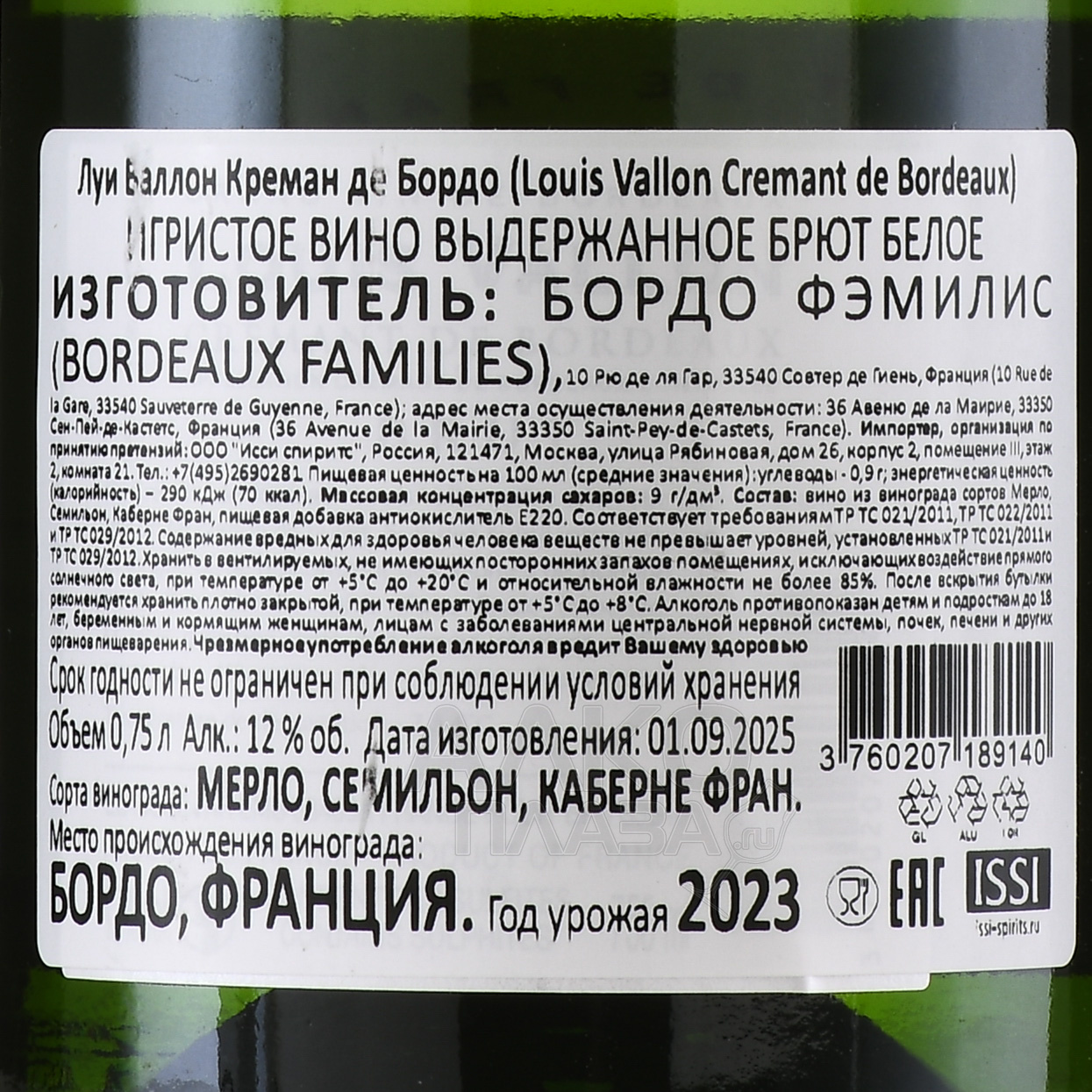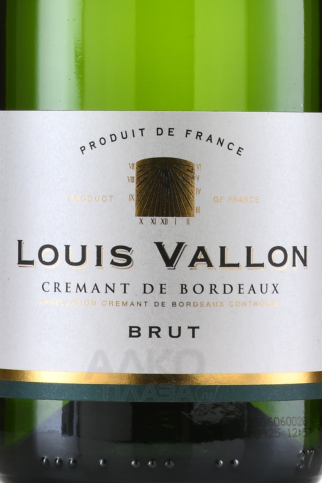 Белое игристое вино Louis Vallon Cremant de Bordeaux 0,75 л производится по традиционному методу на территории Бордо с использованием типичных сортов винограда. Сбор урожая проводится ручным способом, после чего сортируется и далее подвергается прессованию. Процесс первой ферментации проходит в стальных чанах, по завершении которой готовый брют переливают в бутылки с добавлением тиражного ликера. Вторая ферментация протекает в течение 1 года.