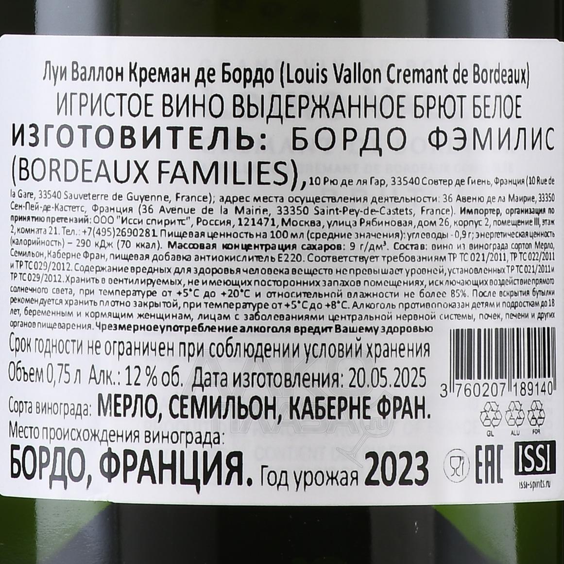 Louis Vallon Cremant de Bordeaux - вино игристое Луи Валлон Креман де Бордо 0.75 л белое брют в п/у прозрачная