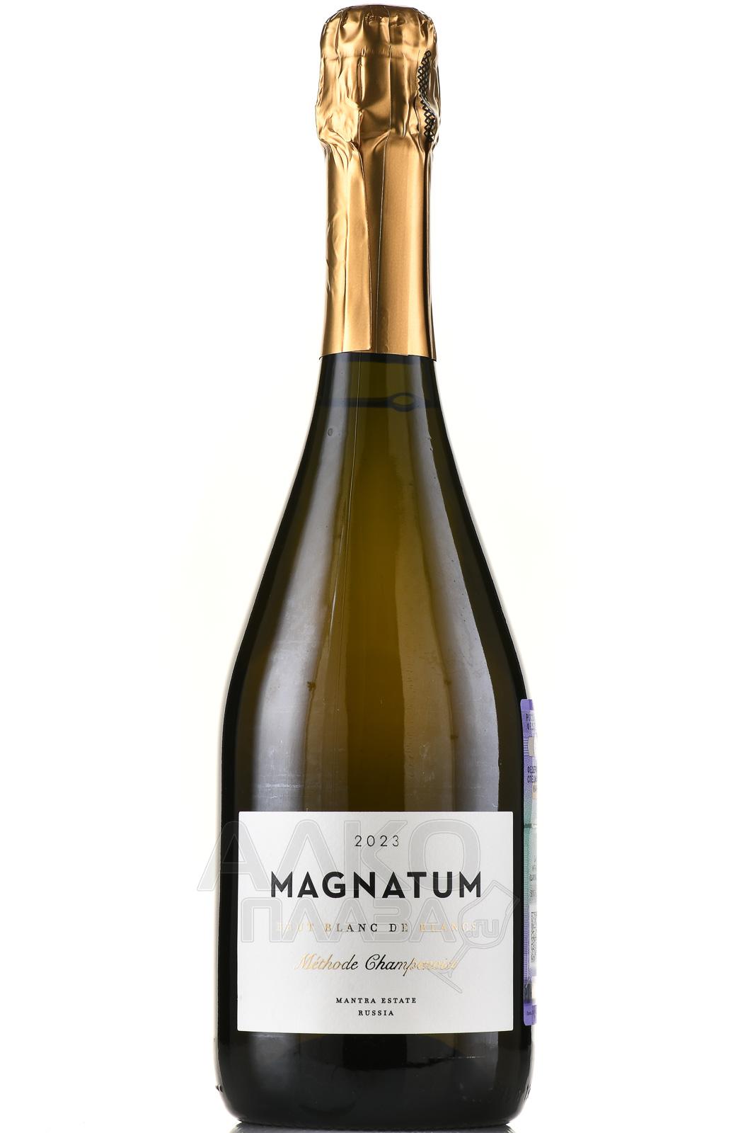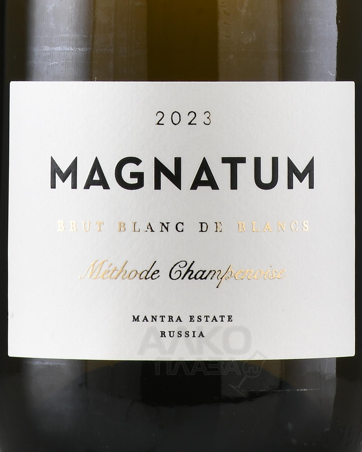 Игристое вино Magnatum Brut Blanc de blancs 0,75 л — элегантный белый брют с содержанием сахара 8 г на литр. Для его производства использовался сорт Шардоне, культивируемый в Крымском районе Кубани. Виноградник разбит на склоне Гипсовой горы, на участке с мергелевыми почвами. Сбор урожая осуществляется ручным способом. Ферментация протекает в стальных емкостях. Брют выдерживается на тонком осадке 18 месяцев.