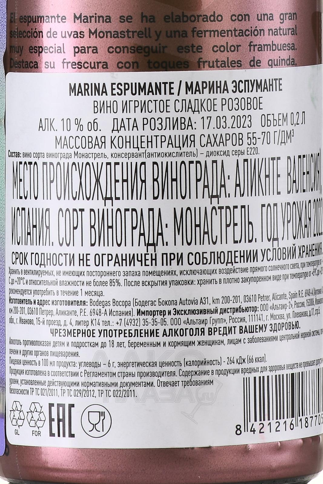 Игристое сладкое розовое вино Marina Espumante 0,2 л – это ключ, с него начинается текст. Этот напиток производится в Испании, в регионе Аликанте, где преобладает средиземноморский климат с жарким летом и мягкой зимой. Виноград сорта Монастрель, используемый для этого вина, выращивается на высоте около 600 метров над уровнем моря, что способствует сохранению кислотности в ягодах. Урожай собирается вручную в начале сентября, когда ягоды достигают оптимальной зрелости. Вино производится методом Шарма, при котором вторичная ферментация проходит в закрытых резервуарах из нержавеющей стали, сохраняя свежесть и фруктовый характер напитка. Marina Espumante отличается легкой текстурой и сбалансированной сладостью, что делает его идеальным выбором для аперитива или сопровождения десертов.