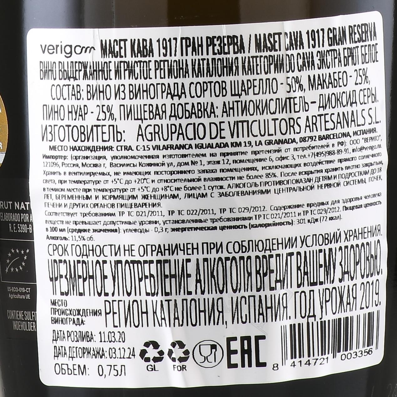 Игристое белое вино экстра-брют Maset 1917 Gran Reserva Brut Nature Cava 0,75 л создано в регионе Пенедес, в Каталонии, где виноградники расположены на разных высотах и получают максимум солнечного света при умеренном количестве осадков. Средиземноморский климат с жарким летом и мягкой зимой позволяет ягодам накапливать сахар и сохранять свежую кислотность. Почвы, преимущественно известняковые с глинистыми включениями, обеспечивают равномерное питание лоз. Урожай собирается вручную, а отжатый из него сок проходит двойную ферментацию, второй раз — в бутылке по традиционному методу и выдерживается не менее 36 месяцев на осадке. Такой процесс формирует сложную структуру, богатую минеральность и характерный сухой стиль, без добавления экспедиционного ликера. Каждый сорт в купаже играет особую роль: Чарелло отвечает за кислотность и долголетие, Макабео — за свежесть, а Пино Нуар придает фруктовые ноты и элегантность.
