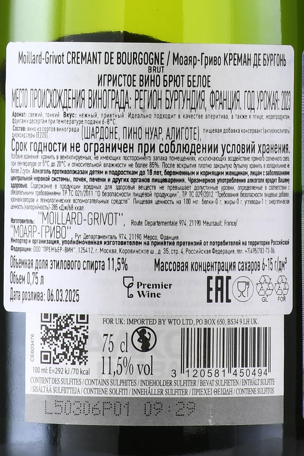 Игристое белое вино брют Moillard-Grivot Cremant de Bourgogne 0,75 л производится в категории бургундских креманов. Виноградники региона расположены на холмистых участках с преобладанием известняковых и мергелевых почв, которые обеспечивают хороший дренаж и придают напиткам свежесть и чёткую структуру. Умеренно континентальный климат способствует сохранению кислотности и формированию сдержанного, элегантного стиля. Производитель использует традиционный метод вторичной ферментации в бутылке, аналогичный шампанскому. Базовые вина получают из сортов, разрешённых правилами апелласьона. Второе брожение проходит на осадке, с обязательной выдержкой не менее 9 месяцев, что закреплено в регламенте.