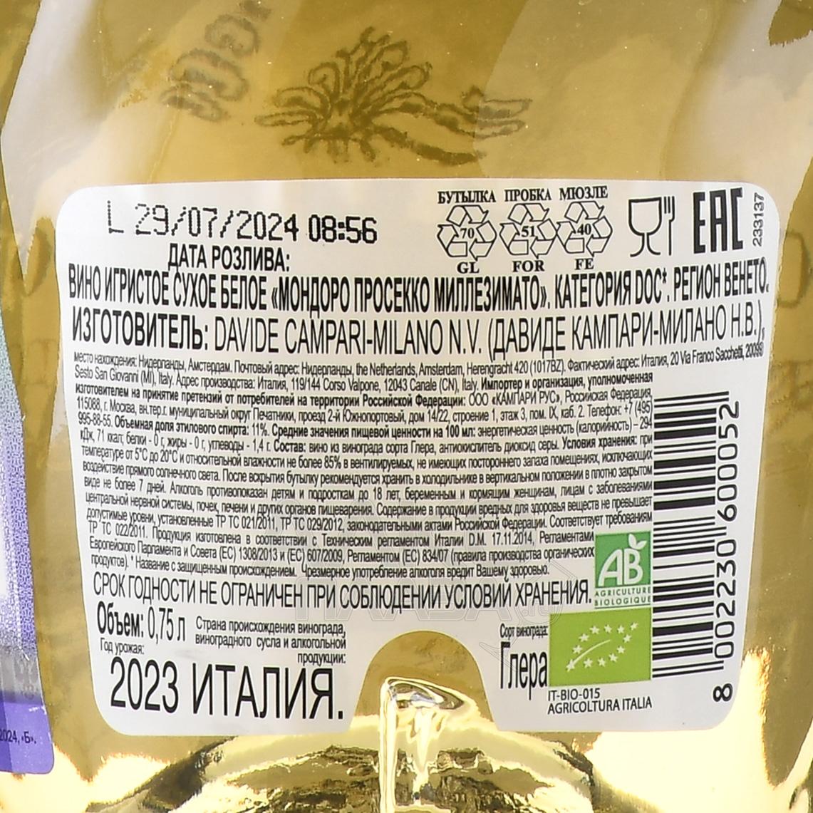 Mondoro Prosecco Millesimato - вино игристое Мондоро Просекко Миллезимато 0.75 л белое сухое в п/у