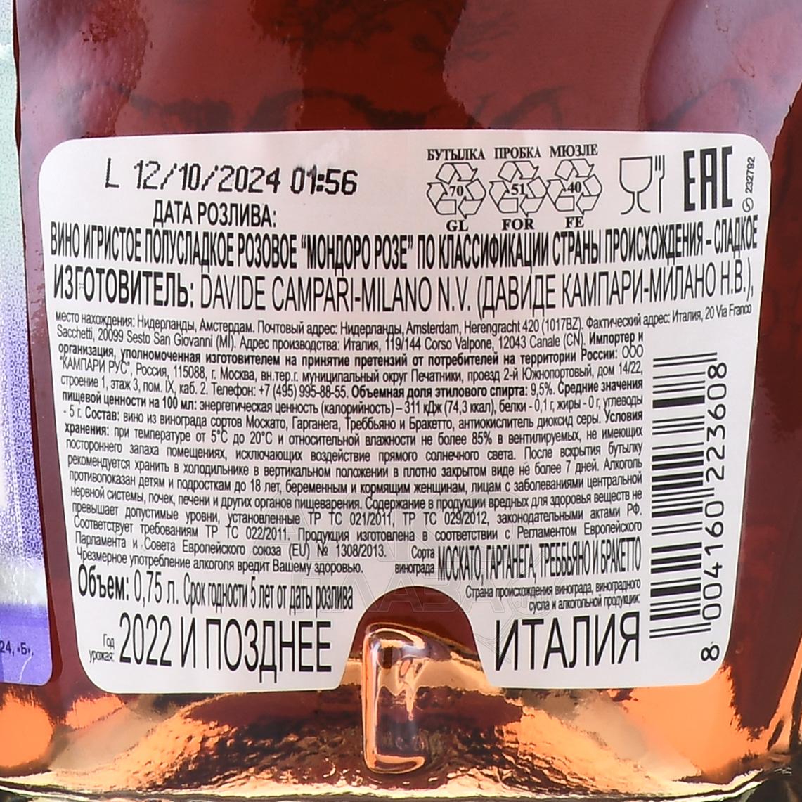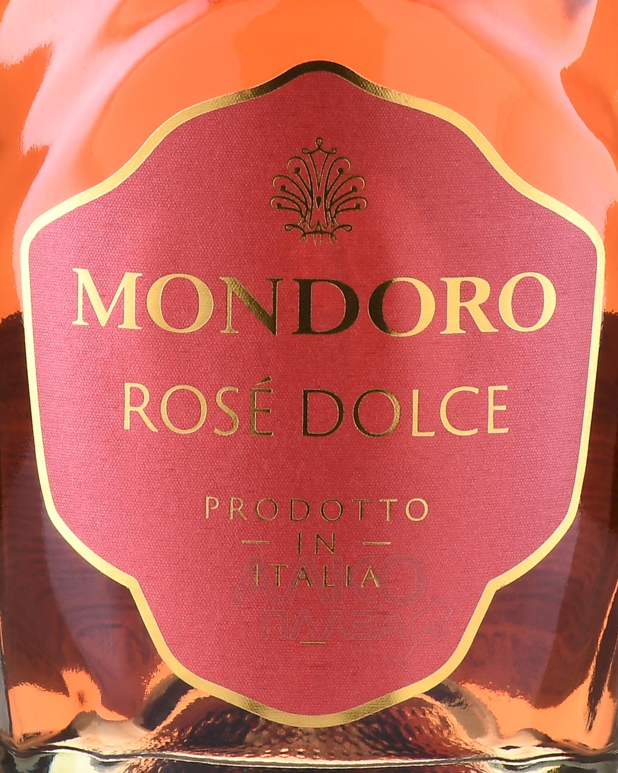 Розовое полусладкое игристое вино Mondoro Rose Dolce 0,75 л изготовлено в итальянском регионе Пьемонт из местных сортов винограда — белых и красных. Его производство осуществилось на оборудовании современного образца под контролем лучших мастеров компании-поставщика — известного на внутреннем рынке хозяйства, которое в данный момент принадлежит легендарному холдингу Кампари Груп. Сусло ферментировали по технологии Шарма, то есть обработка проводилась только в стальной таре. По ее завершении игристое вино разлили по бутылкам стандартного объема под давлением. Рекомендуется дегустировать его без продолжительного хранения, в течение двух-трех лет после приобретения.
