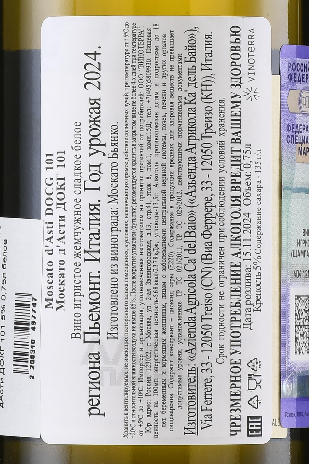 Ca’ del Baio Moscato d’Asti DOCG 101 - вино игристое Ка’дель Байо Москато д’Асти ДОКГ 101 0.75 л белое сладкое