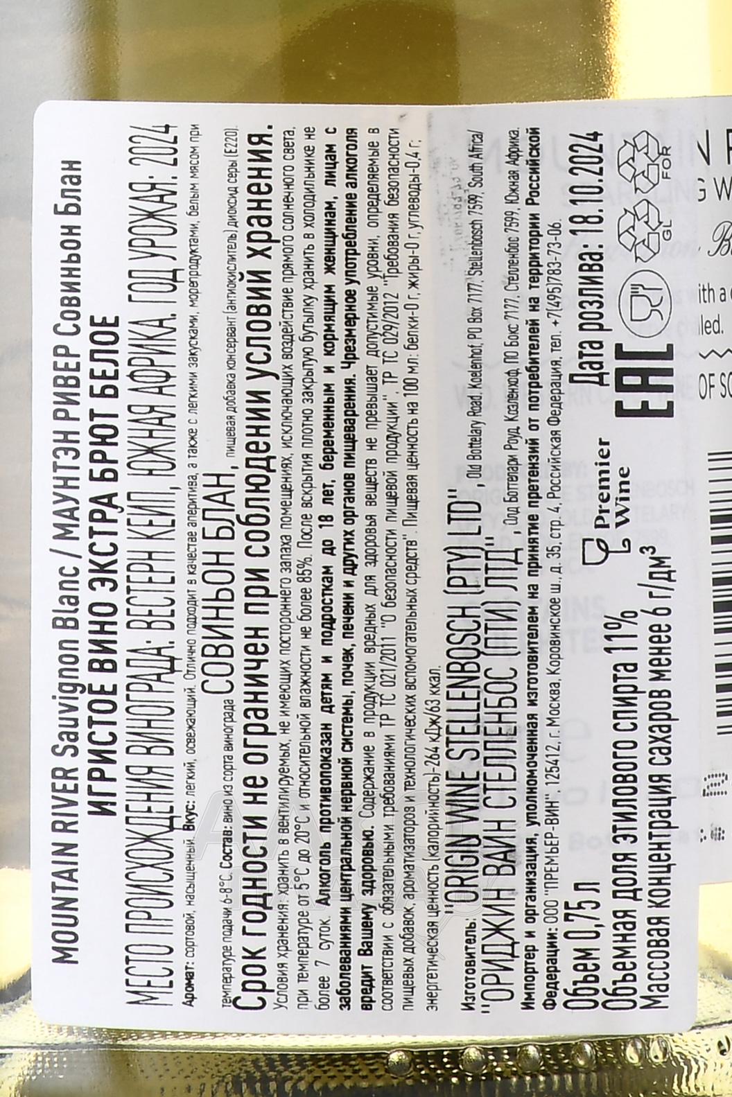 Игристое белое вино экстра-брют Mountain River Sauvignon Blanc 0,75 л производится в ЮАР. Ягоды собирают в регионе Западный Кейп. Сбор проходит в прохладные предутренние часы. Сами виноградники также находятся в зоне, в которой в ночные часы температура значительно понижается, благодаря чему плоды при созревании сохраняют оптимальную для винификации кислотность. Процесс производства основан на двойной ферментации с добавлением дозажа с минимальным уровнем сахара перед вторым брожением. Для приобретения баланса напиток недолго выдерживают на осадке.